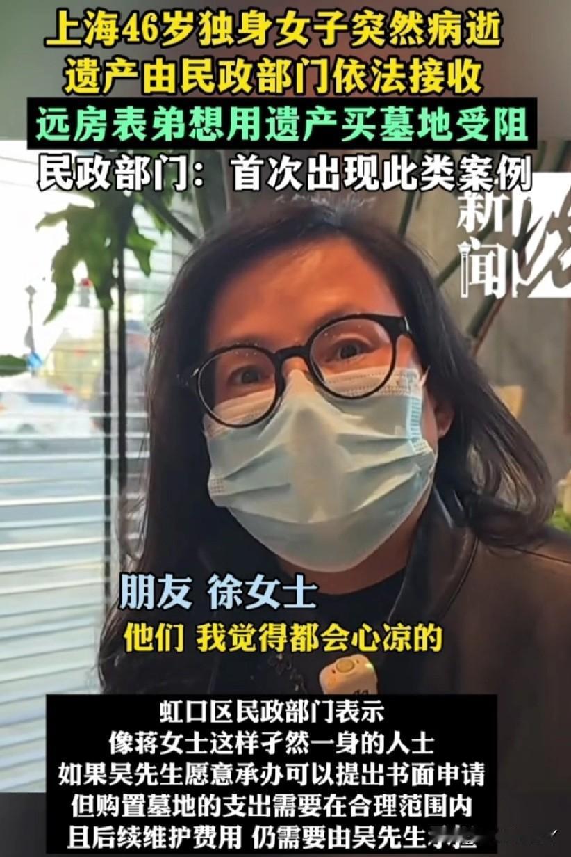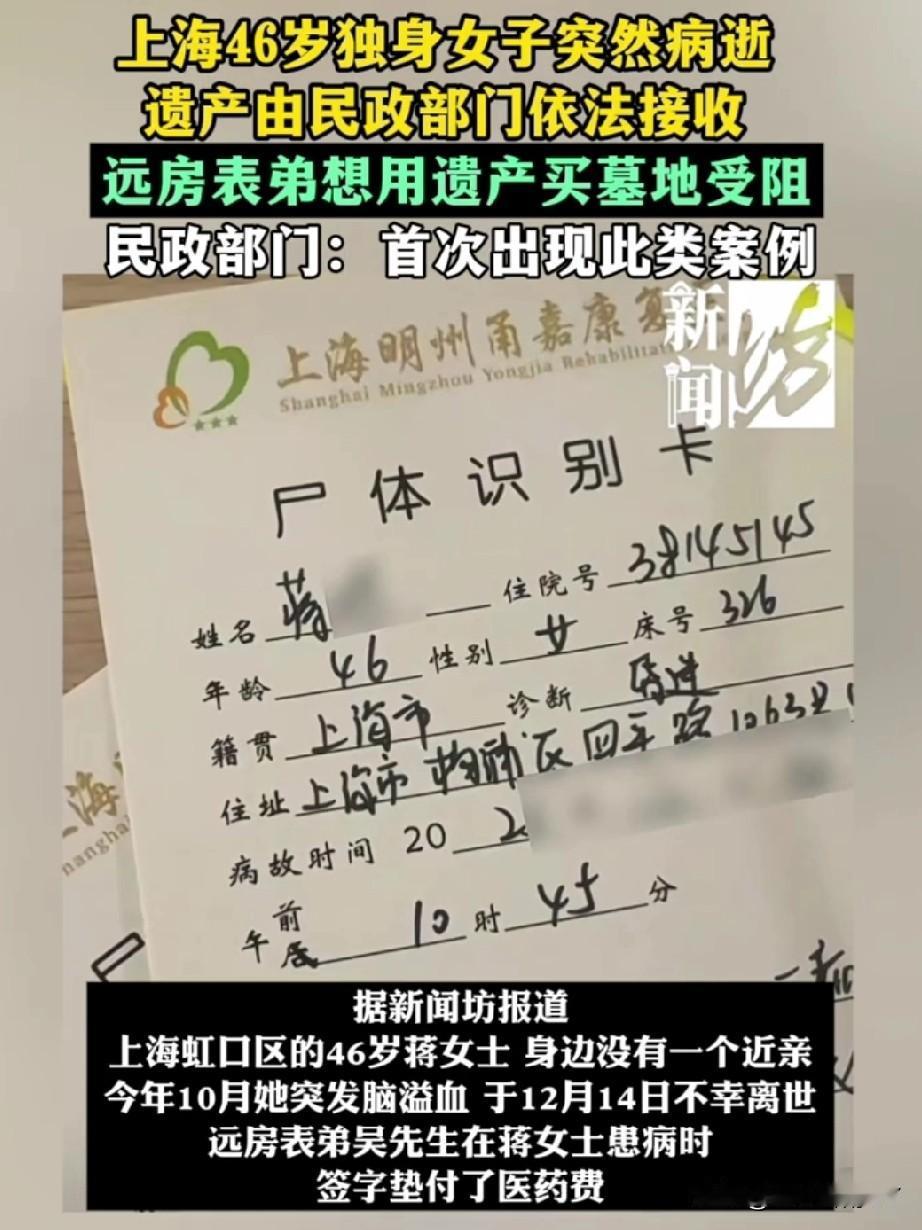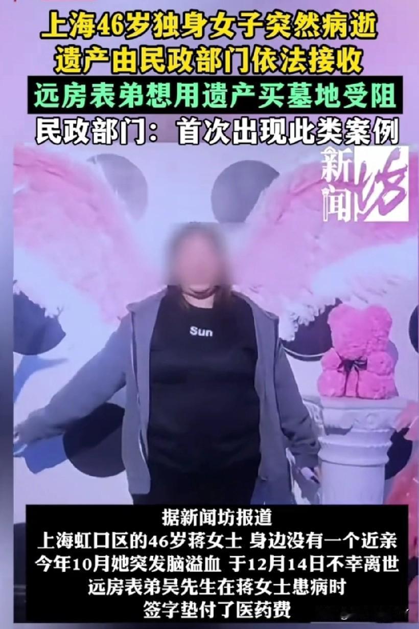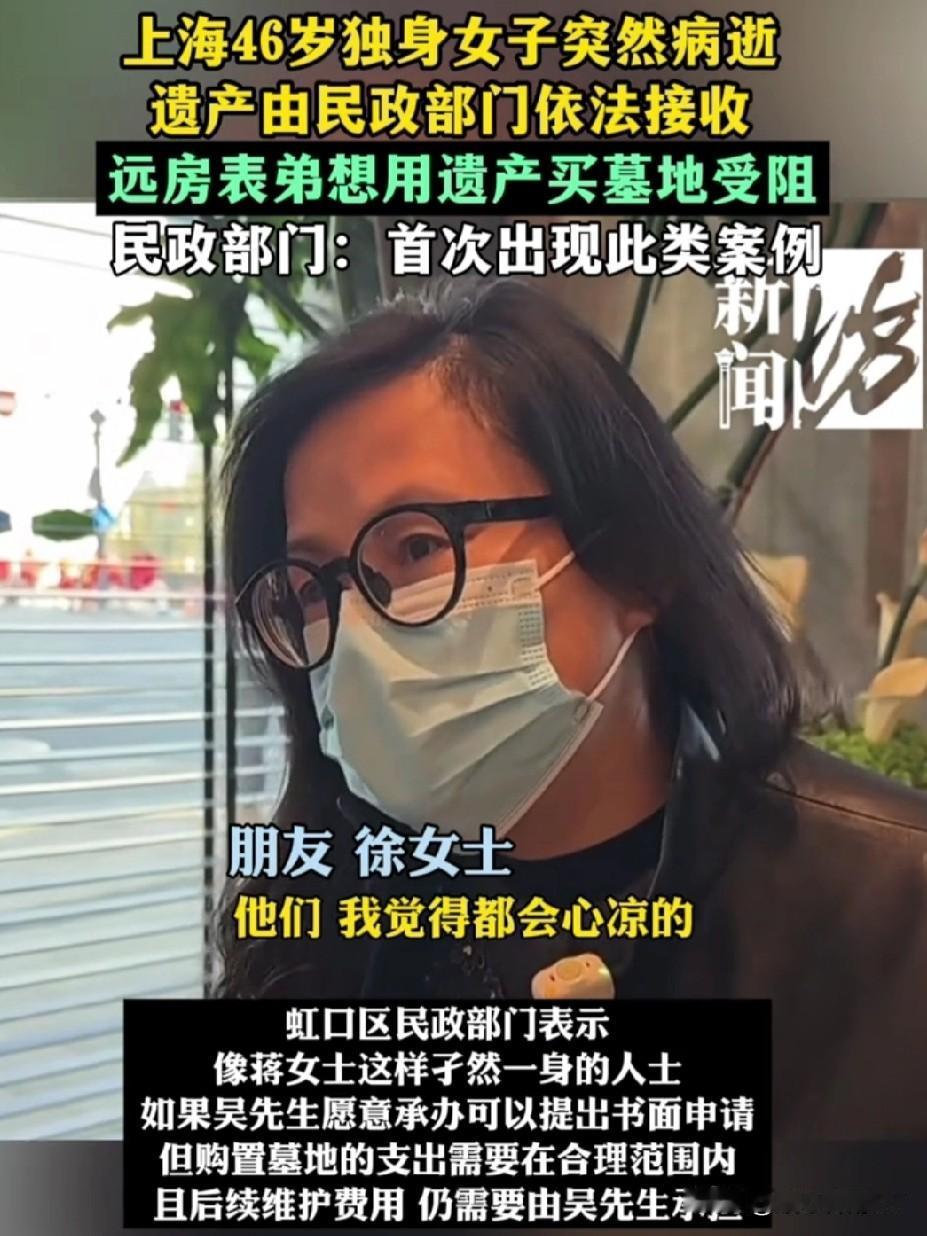 独生女子病逝遗产归民政,这背后藏着多少单身人士的隐忧? 上海一位46岁独生女子病逝,因无继承人,她的遗产由民政部门接收,远房远方表弟想买墓地都受阻碍。 这一则新闻戳中多少单身人士的心!辛苦打拼一辈子积攒的积蓄,最后却成了“无主财产”。 我们拼命赚钱,到头来却可能连自己的身后事都无法妥善安排,甚至自己的钱都花不到自己身上。 这不仅是遗产归属的问题,更是反映出无数单身人对未来的迷茫:我们的努力,最终究竟该何去何从?希望这样的案例能够推动相关政策更加人性化,让每个认真生活的人,都能给自己的人生一个圆满的交代。