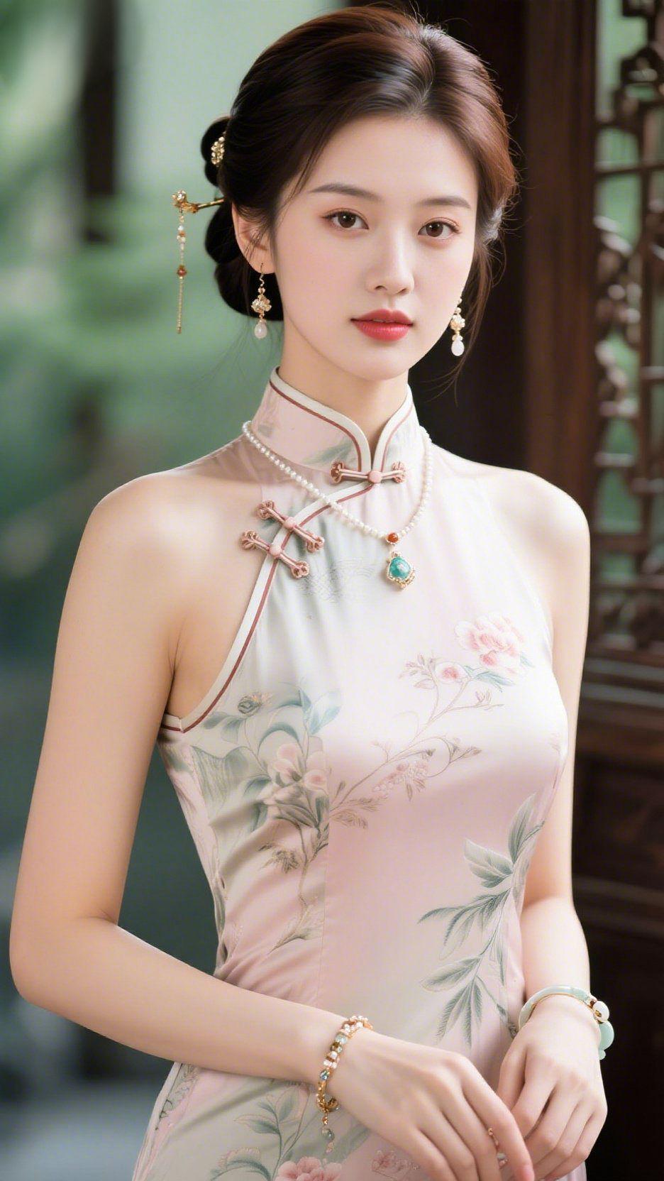 《淡粉旗袍里的清韵》 木窗裹着绿的柔,她是这静意里轻落的一抹淡粉——旗袍裹着云般的软,盘扣是衣间点染的雅,连襟边的花影都沾了古意的温。 她立在光影间,发间金簪摇着细的光,眉眼里的静是化开的春露,裹着雅色却把暖意漫得周身舒展。唇色是红里藏的柔,望之便觉风都浸了软的甜。 美从不是艳色堆砌,是旗袍裹的韵、是眉眼藏的清——像案头轻展的画,不张扬却润得恰好,望之便觉心尖妥帖,连呼吸都沾了古意的暖,落进心里,便成了化不开的舒然。 淡粉旗袍韵 古意国风感