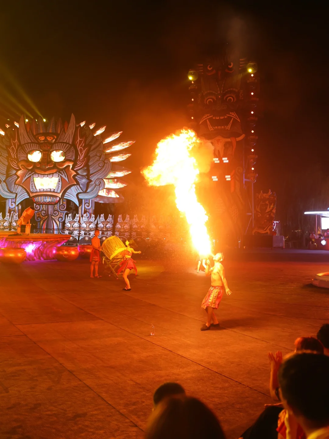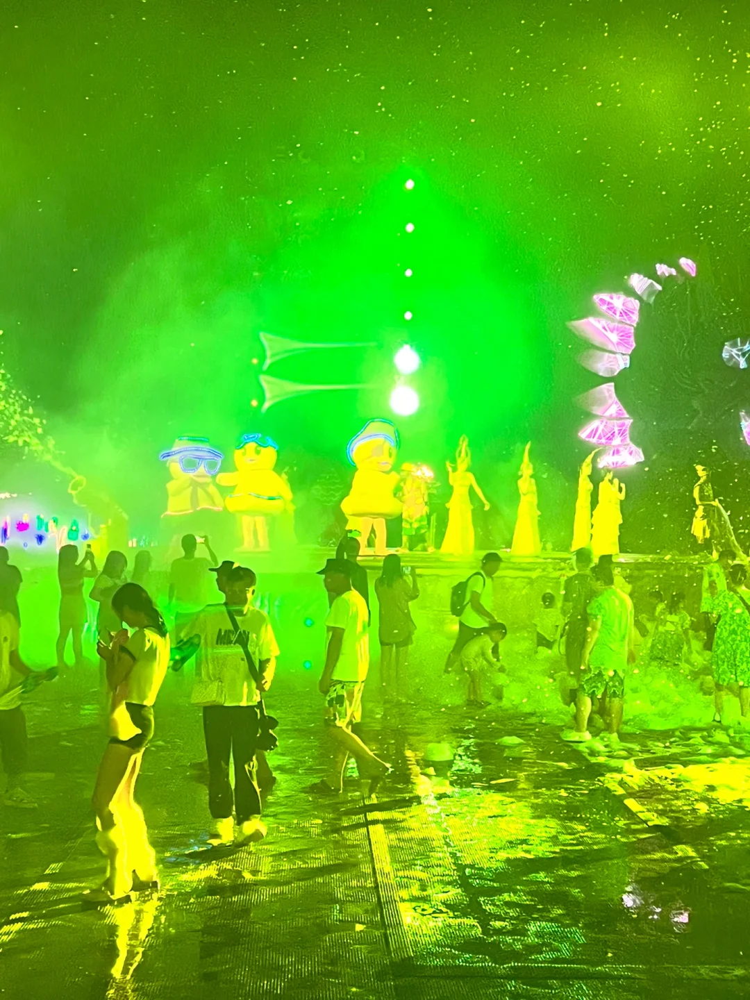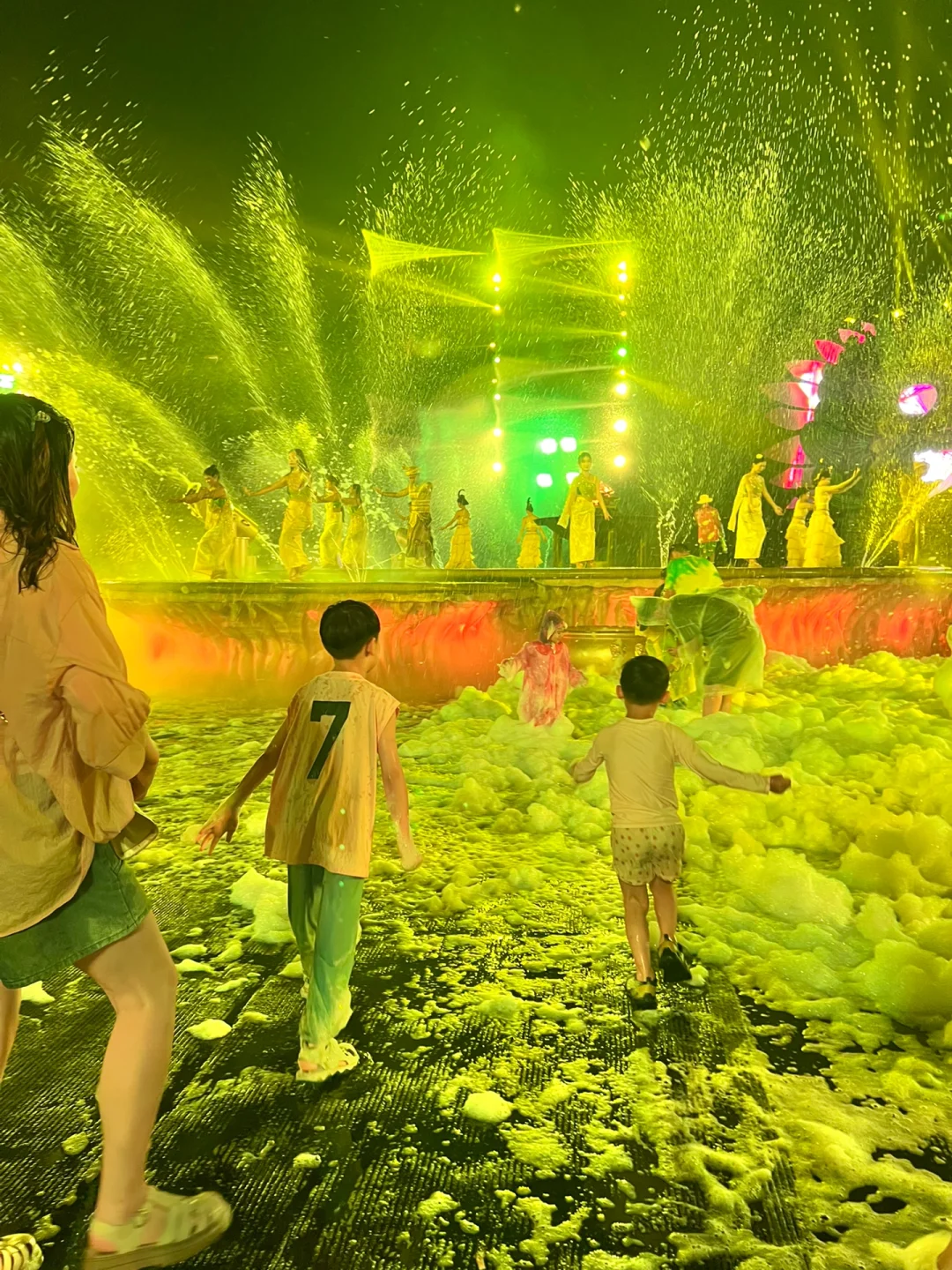 晚上的表演娃们很喜欢💕有喷火、打铁花,还有超美的烟花秀🎆烟花结束就是两个娃期待了一天的泼水节了,现场氛围超嗨的!哥哥在泡泡那里玩得拉都拉不走!夏天就是要玩水呀!