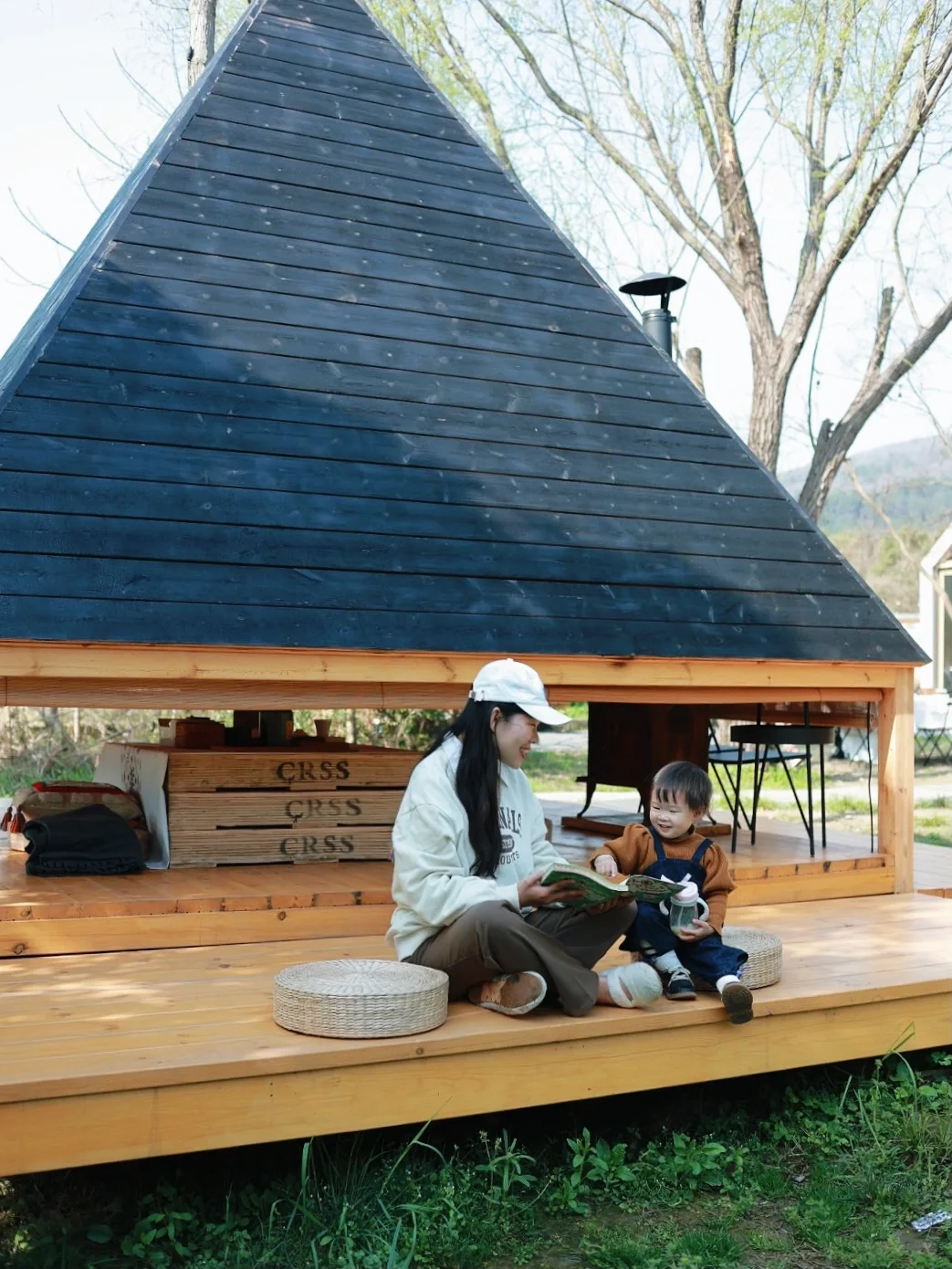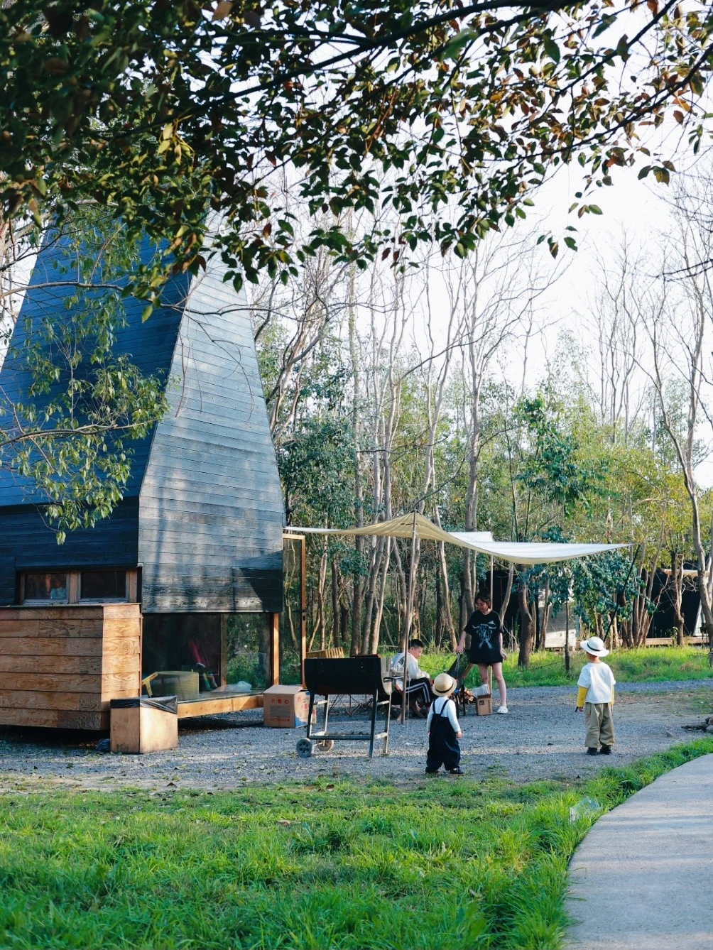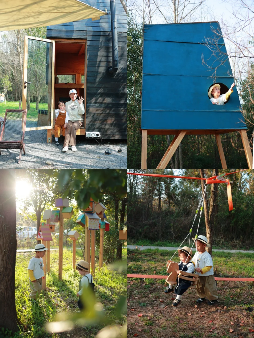 ⛺️这里其实很适合带小朋友过来玩,可以在森林里面探索大自然,每一栋房子形状也都不一样,有些小房子他们可以爬上去,像树屋一样!还有一个专门的阅读区,有很多小盆友可以看的书籍📚旁边还有秋千、吊环这些,我们家两个宝贝可以在这里玩好久😊