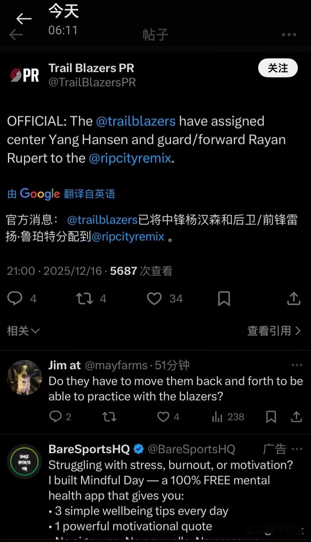 杨瀚森再次被下放发展联盟混音队有望涅槃重生!在强度拉满后是否能够继续高效输出,我们拭目以待! 杨瀚森将备战10点钟混音队与斯托克顿国王队的比赛! 刚刚与开拓者主队训练完,紧接着又被派遣混音队打比赛,连轴转的训练赛程杨瀚森会不会吃不消? 还是一样开拓者主队将吕佩尔一块下放,跟杨瀚森做个伴!天天有球打,训练量加满! 连续背靠背的比赛加上还要训练,杨瀚森可别练伤了!毕竟细水长流!