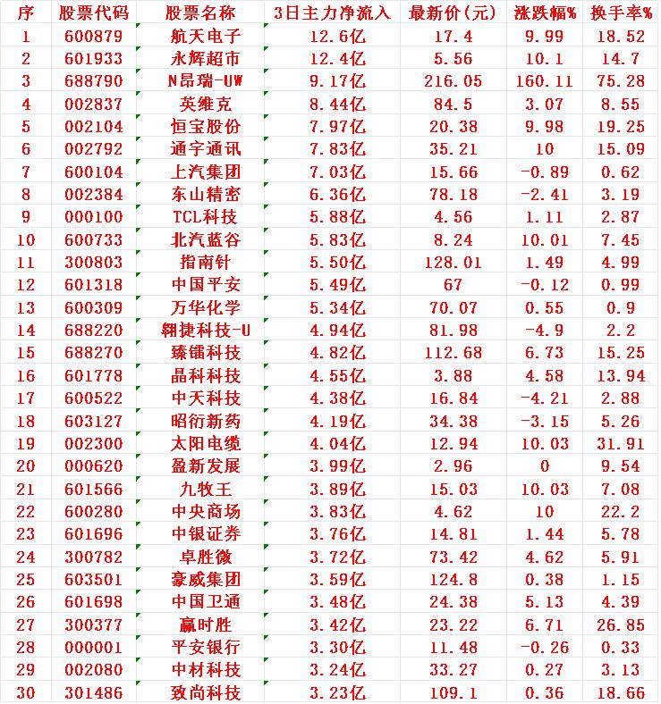 12月17日,前3天主力大幅买入的30名单! 航天电子:3日净流入12.6亿元,最新价17.40元,换手率18.52% 永辉超市:3日净流入12.4亿元,最新价5.56元,换手率14.70% N昂瑞-UW:3日净流入9.17亿元,最新价216.05元,换手率高达75.28% 英维克:3日净流入8.44亿元,最新价84.50元,换手率8.55% 恒宝股份:3日净流入7.97亿元,最新价20.38元,换手率19.25% 通宇通讯:3日净流入7.83亿元,最新价35.21元,换手率15.09%