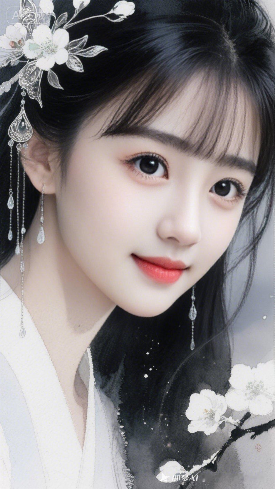 黑发红唇美人垂眸含情,狭长凤眼配长睫毛,精致妆容缀美人痣,簪花满头银饰晃,素衣裹身,似水墨谪仙。