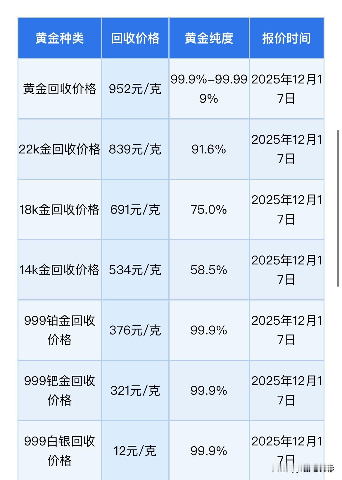 快看,下降了! 最新黄金回收价格出炉了! 足金回收价格952元/克, 铂金回收价格376元/克, 钯金回收价格321元/克, 同比与昨天黄金回收价格有所下降,足金下降了8元,反而铂金上涨了15元,钯金上涨了23元。 影响黄金回收价格的因素 1:当天黄金实时报价, 2:黄金的纯度。 另外黄金回收是不看品牌的,品牌和不是品牌的黄金回收价格是一样的。 所有信息都只是提供参考价值! 购买黄金有风险,请保持理性购买! 金价回收行情 黄金售卖价格 黄金价 黄金回收价攀升 黄金一克720 黄金回收价 金价黄金回收