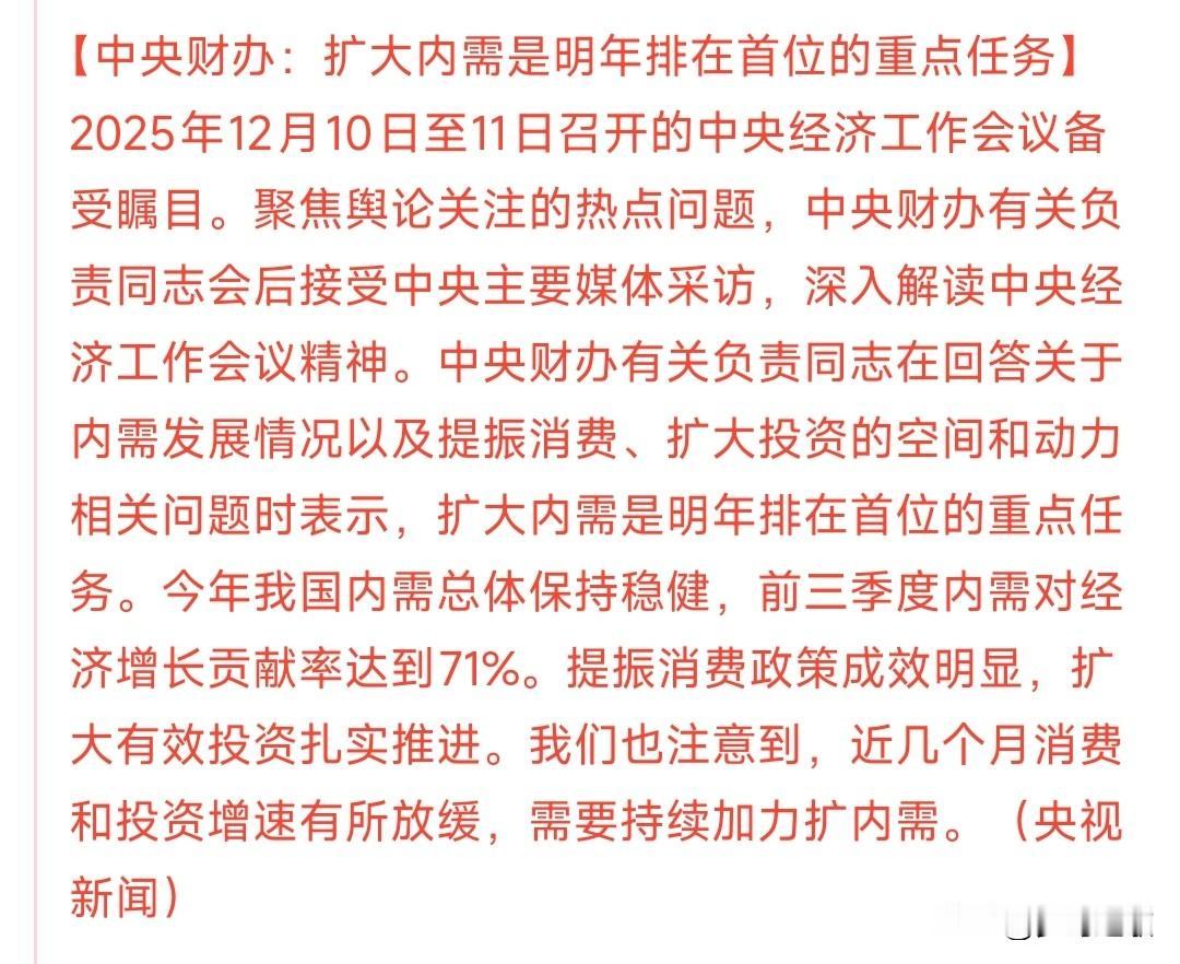 扩大内需已经上了央视新闻,明年的主要任务 这个消息应该是今天最大的利好,消费板块将会受益。前边已经把扩大内需上升到了战略层次,这次财办重提可见重视程度。 进出口,投资,消费拉动经济的三驾马车,前两位已经远远走在了消费的前面,从今年居民存款的额度和去年持平就可以看出,钱并没有拿出来消费,而是在银行。 从政策看明年将会有很多刺激消费的政策,这也为消费板块打好了预期,今年是科技股的牛市,明年会不会上是消费的牛市?