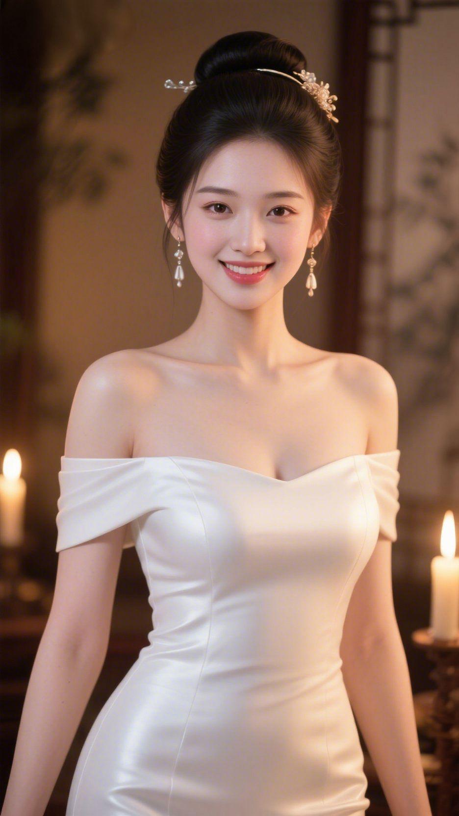 白裙藏尽东方韵 烛影轻轻摇曳,晕开一室暖黄的光。她梳着精致的中式发髻,珠饰点缀发间,似撷了一缕古典的韵致。一袭白缎露肩裙,柔滑的面料在光影里漾着细腻的光泽,简约的剪裁衬得身姿温婉舒展。眉眼间盛着浅浅笑意,像江南春日的烟雨,温润又动人,唇角的弧度轻软,似月下轻晃的流萤,点亮了周遭的氛围。 这份美好,是东方美学里独有的温婉与雅致,不张扬,却如清茶般回甘。烛火的暖光裹着中式背景的古意,与她身上的现代裙装相融,揉合出传统与当下碰撞的惊艳。原来美从不是单一的模样,是古典韵致的沉淀,是眉眼间藏不住的温柔,是平凡光景里,那份用心雕琢的精致与美好,轻轻叩击着心底对东方美的眷恋。 中式美学意境 温婉气质之美