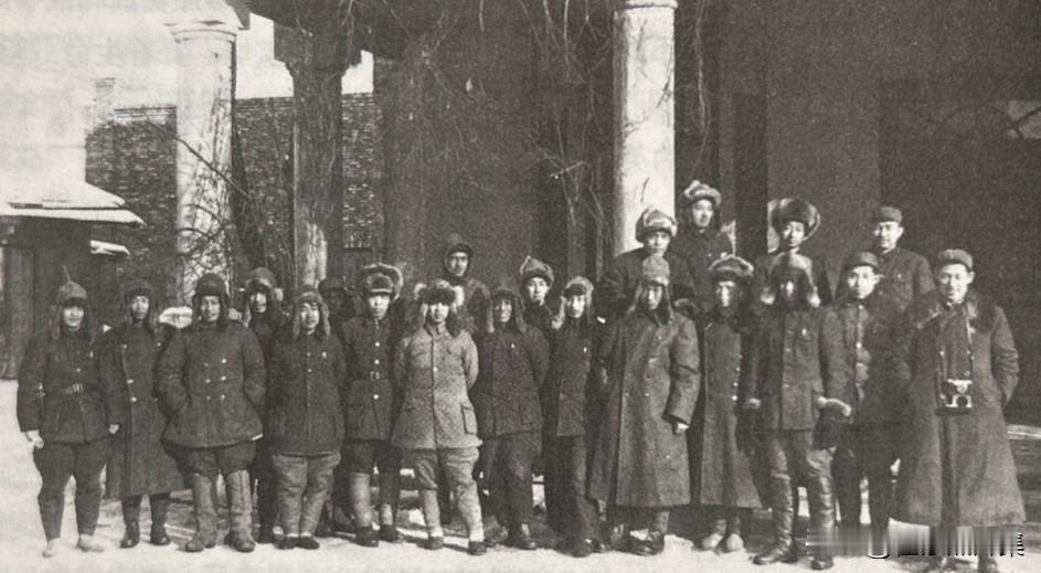 1948年初,松江军区全体干部的集体影像,前排左起:司令员陈光、政委张秀山、副司令员李寿轩、参谋长熊伯涛、政治部主任黄文、政治部副主任李新民、保卫部长马伯生、宣传部长陈钦、政治部副主任季铁中等。松江军区成立于1945年11月,在辽沈战役中承担了重要任务。陈光率部参加了长春围困战,通过敌工情报工作摸清了守军兵力情况,获取了长春地下排水系统图纸,为长春和平解放作出了贡献。1948年12月,东北军区命令撤销松江军区,成立松江军事部,季铁中任部长.