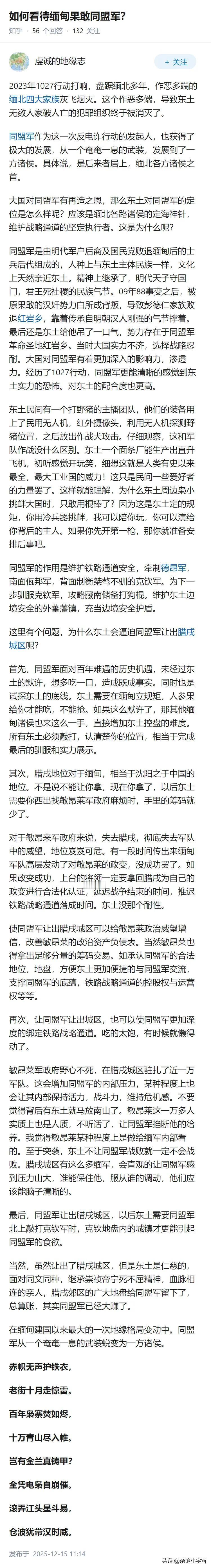 果敢同盟军撤出腊戌市是拐点! 这也就意味着缅北不会有大战事了,后续就是小规模的争夺地盘,抢夺部分村庄的控制权而已。缅甸政府军也是怕了,如果真的压迫过大的话,再来一次腊戌会战,那大概率还是要输掉的。 所以果敢同盟军有心理优势,腊戌市让出来就算了,周边区域是不可能让出来。缅甸政府军感到周围都是对手,随时会被吃掉,做事就谨慎的多。就像卧榻之下,全都是对手在虎视眈眈,谁能睡安稳了? 木邦县之前争夺比较惨烈,现在要和平要回来,已经不可能了。腊戌市交回去,已经是天大的面子了。虽然要打通腊戌到木姐的交通线,但是一路全是民间武装,已经难以控制。 果敢同盟军已经彻底做大了,缅甸政府军已经奈何不了,接下来就只能是合作。当年国军残部打的缅甸军队很惨,没想到几十年后的现状,仍然是如此情况。缅族确实不善战的族群,缅甸北部的威胁,始终笼罩在缅甸上空。 缅甸地形是北高南低,北方少数民族的军事威胁,一直压在缅甸头上。所以缅甸政府军不会放弃执政,要彻底打垮缅甸反对派和民间组装。但是缅族不善战,再打几十年,也就仅此而已。