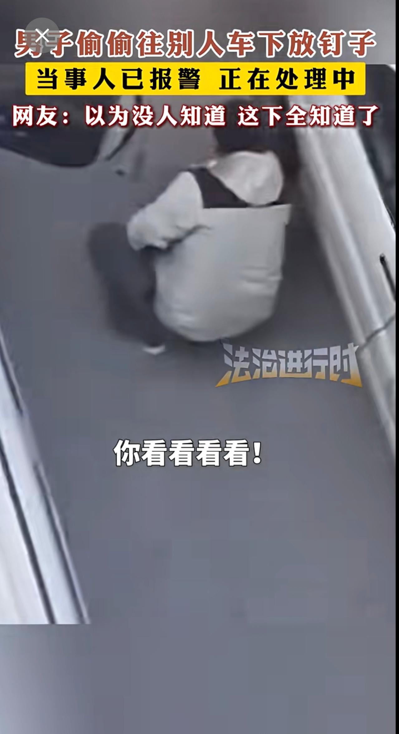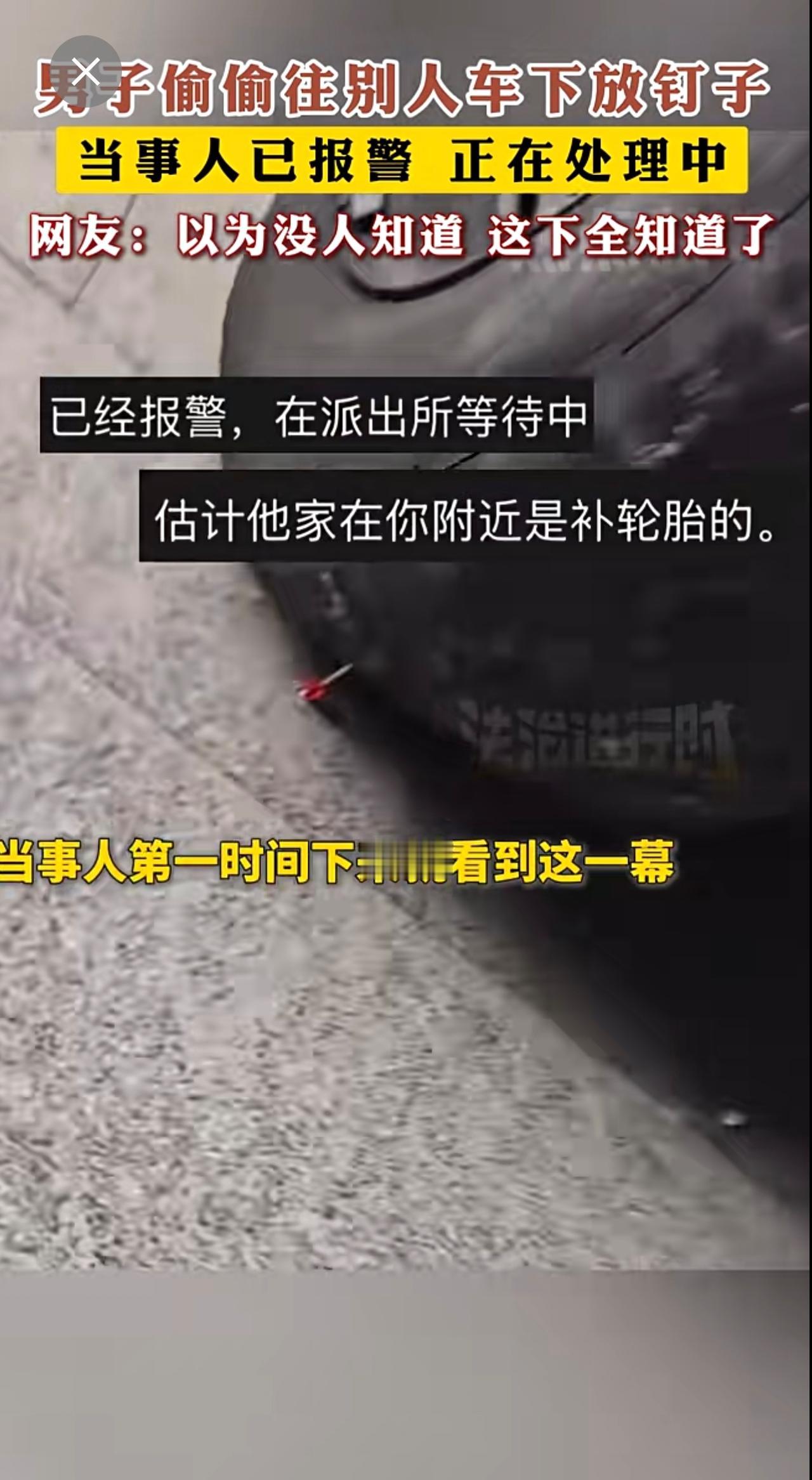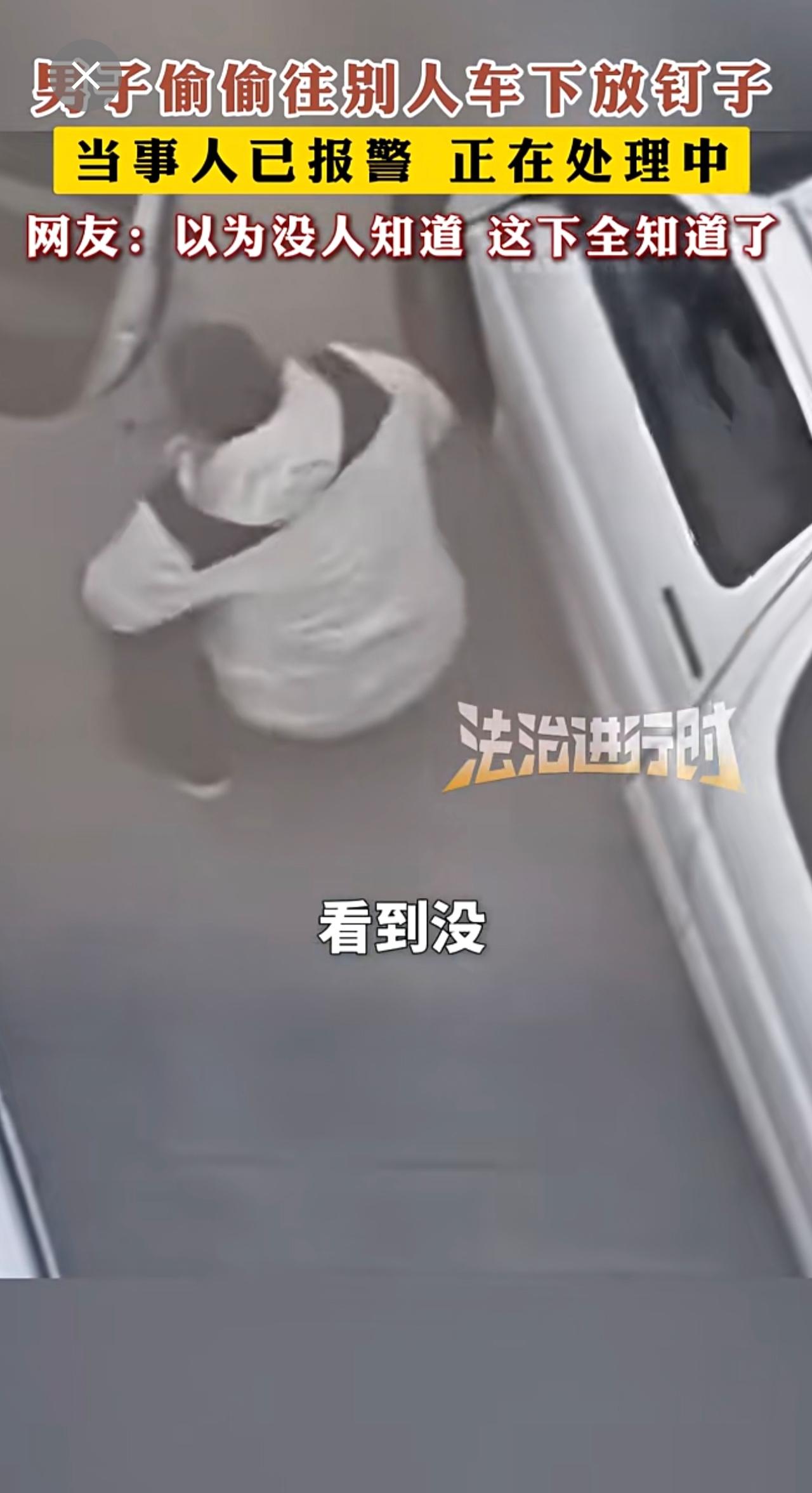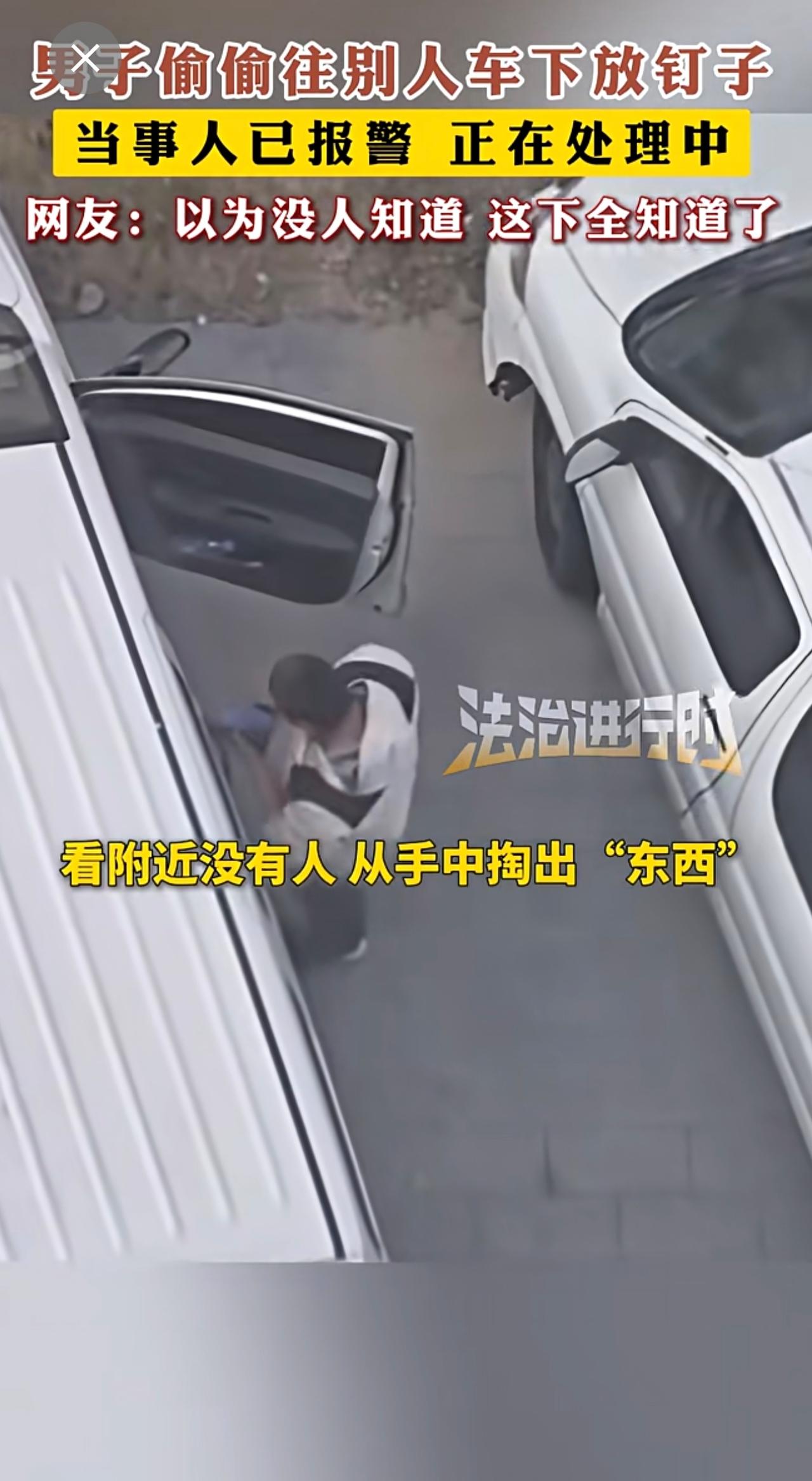 男子偷偷往别人车下放钉子 网友:以为没人知道 这下全知道了。