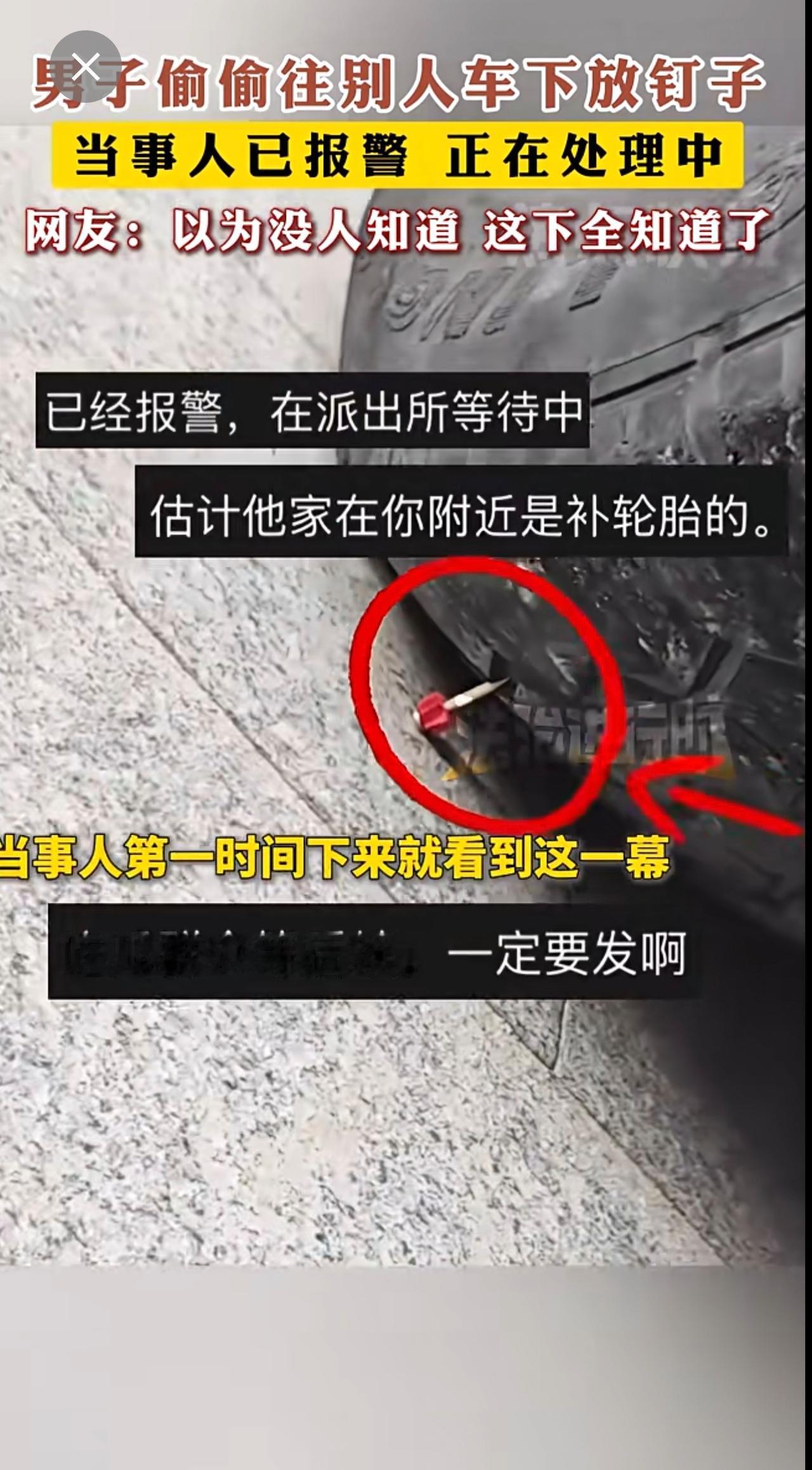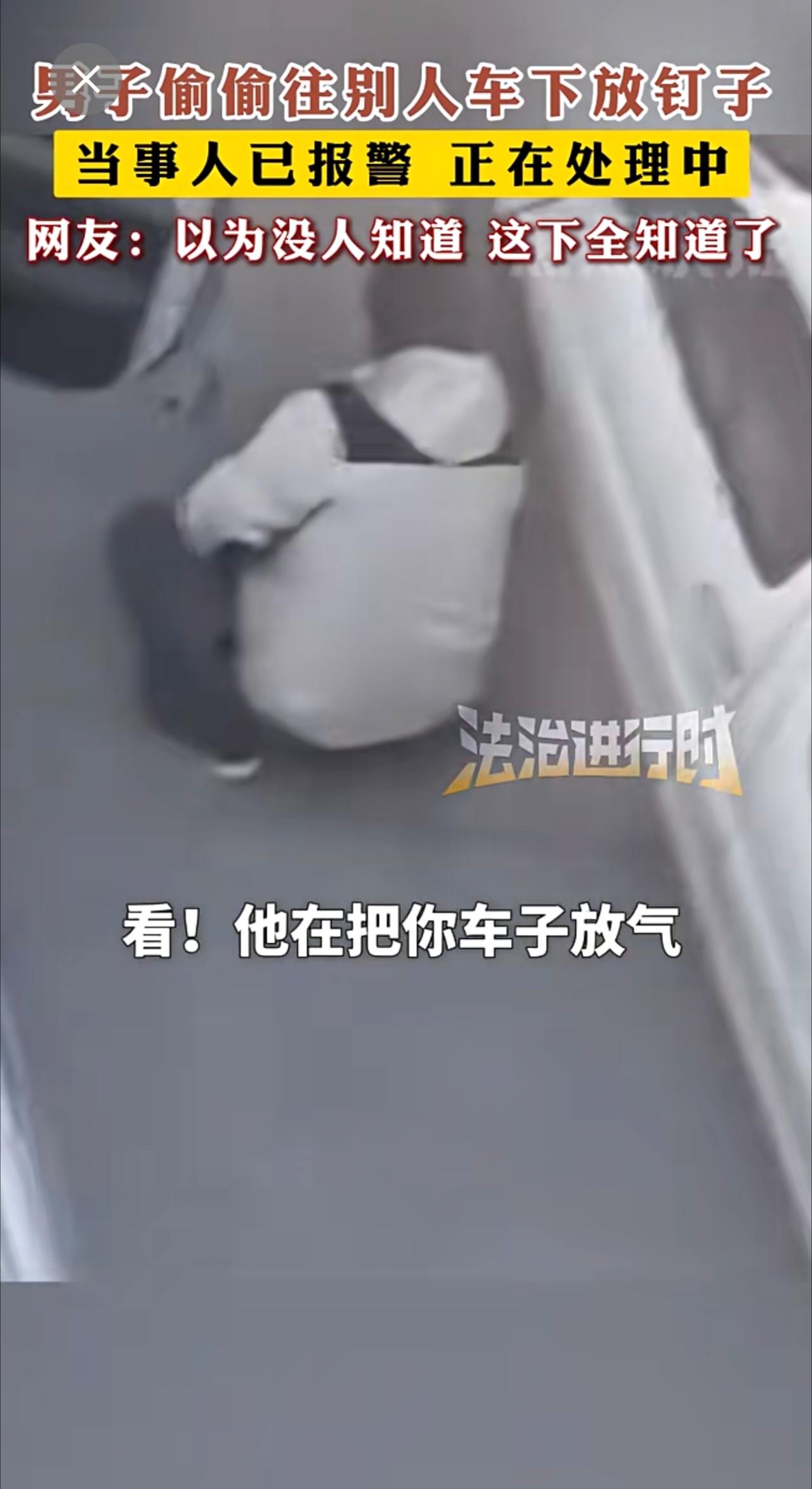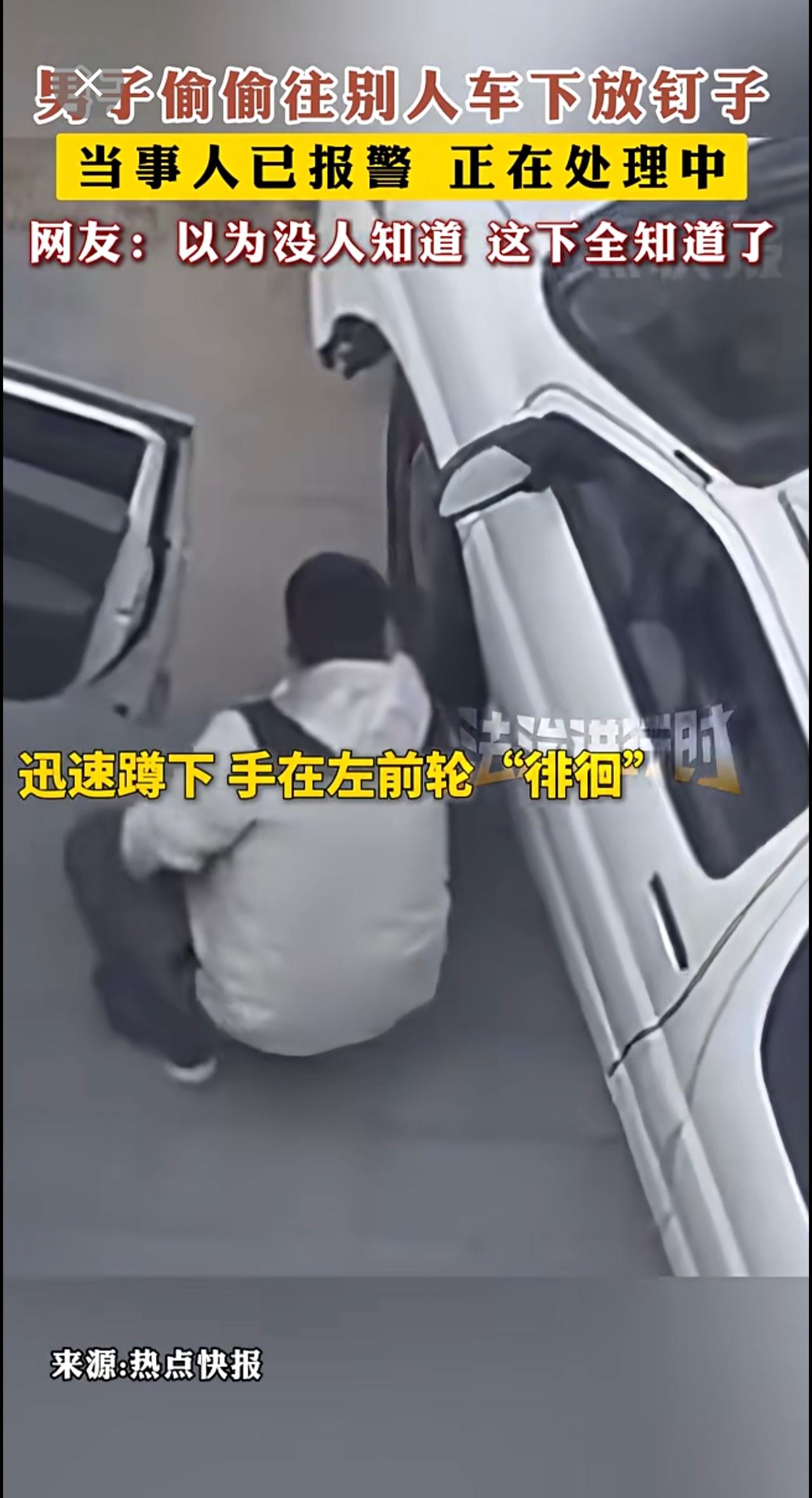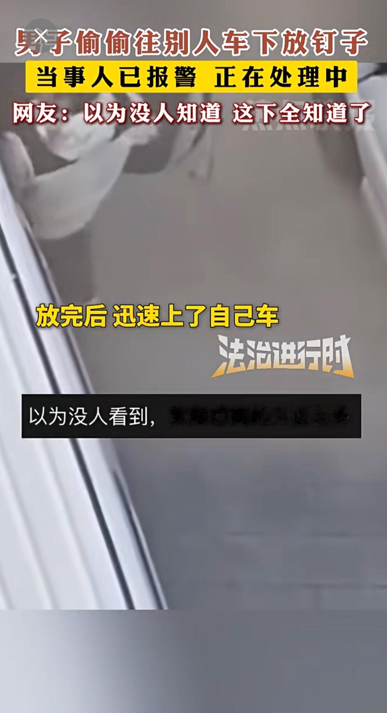 男子偷偷往别人车下放钉子 网友:以为没人知道 这下全知道了。