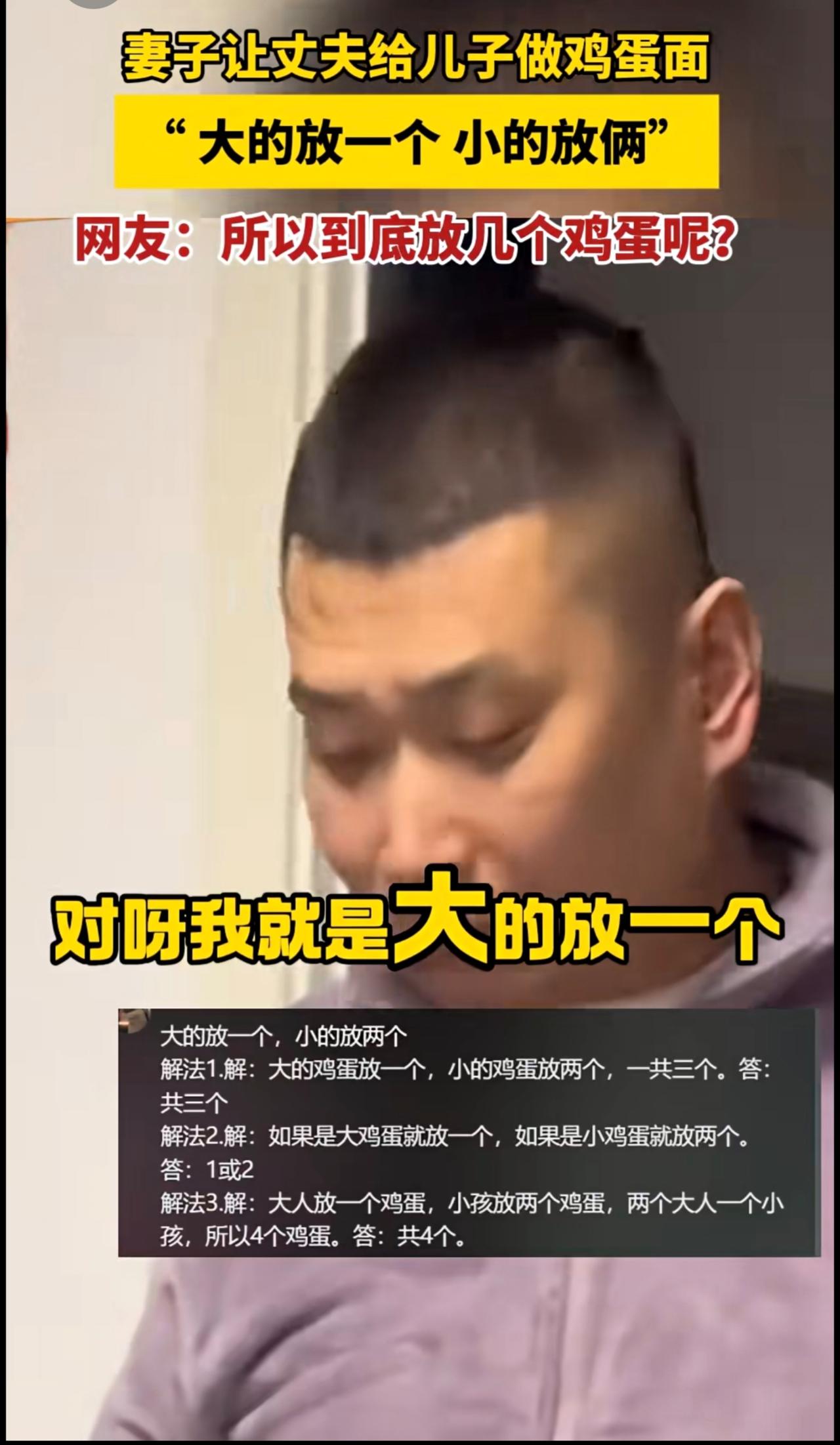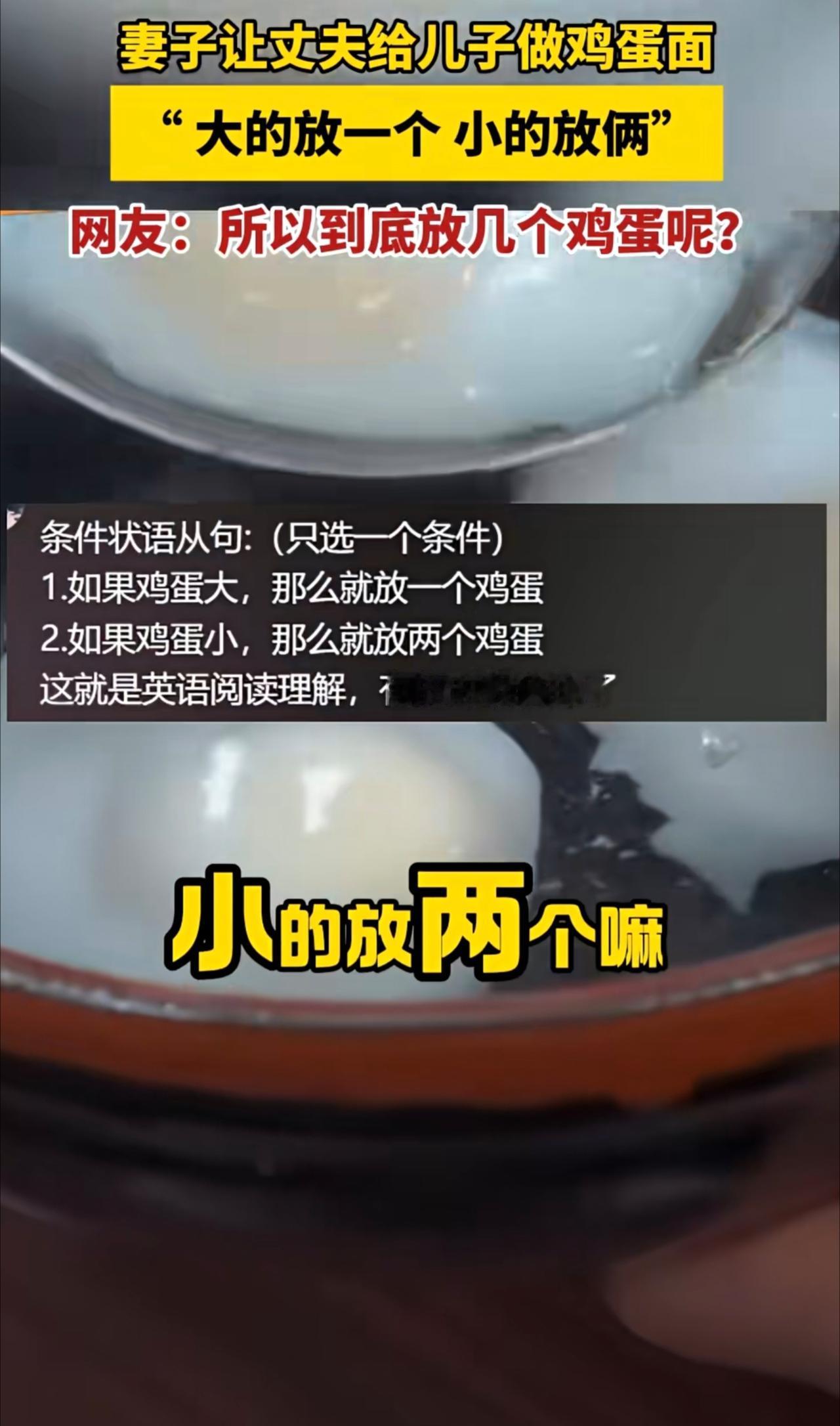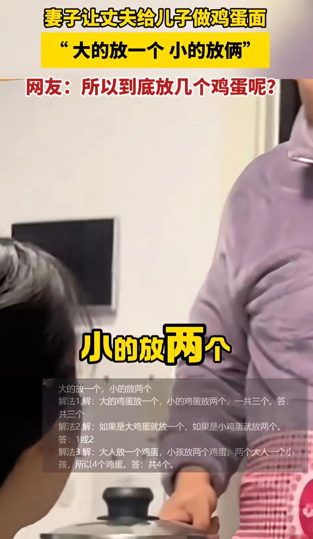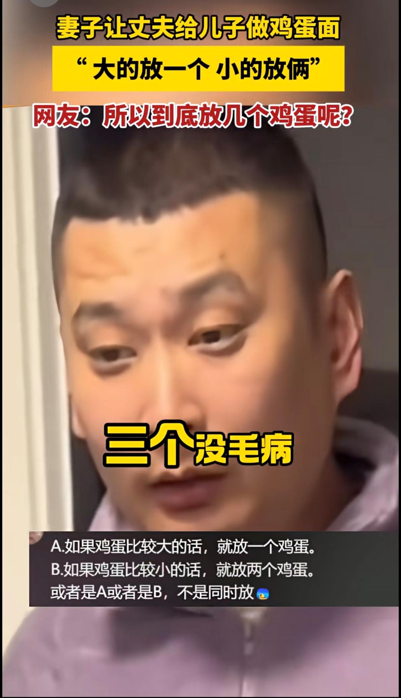 妻子让丈夫给儿子做鸡蛋面 “大的放一个 小的放俩” 网友:所以到底放几个鸡蛋呢?