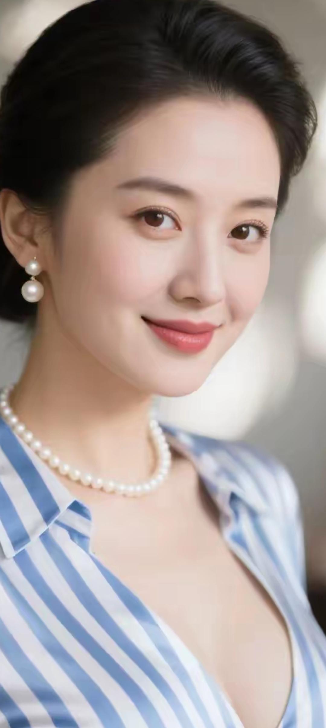 优雅珍珠耳环,蓝白条纹衬衫,温柔微笑,气质满分!