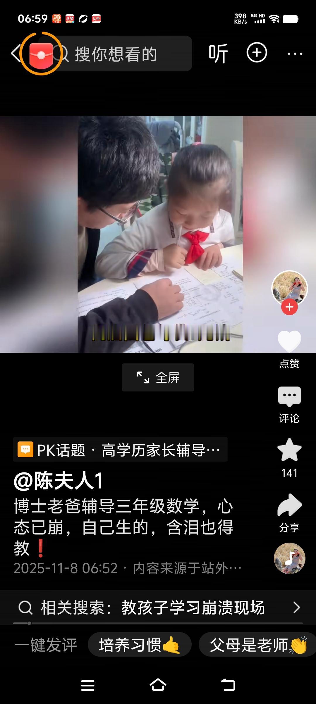 这道题究竟该怎么辅导孩子?一位博士爸爸辅导女儿做这道数学题,辅导到崩溃! 题目如下: 妈妈去超市买面包,超市搞优惠活动,面包3块钱一袋,买三袋送一袋,妈妈要买12袋面包要花多少钱? 爸爸问女儿,买3个面包要9元,买3个面包超市多给1个,那就是你花了9元钱会得到几个面包,女儿回答4个,这个问题很好理解,女儿回答痛快! 可到了这道题关键的一步了女儿有点懵了。 爸爸,接着问妈妈要买12个面包,那要花多少钱呢? 女儿回答48元! 爸爸,当时气笑了! 接着给女儿讲买12个面包花多少钱,我们就要看看12里面有几个是4, 女儿也知道12里面有3个4,但是就转不过来,妈妈买12个面包,需要多少钱这个弯弯! 女儿不是不会算,而是当他思考12 里面有几个字的时候,他早已经忘了妈妈买4个面包花9块钱, 女儿就是始终不能把买四个面包花九块钱和12 个面包里面有3个4这两者联系起来, 他就想不好四个面包花九块3个四个面包花多少块? 这时候爸爸可以通过食物突破这个难点可以拿来12铅笔或者12粒花生等等让孩子分一分,把12 支铅笔每每4支分一份看看能分几份,然后在每4支一份的下面标上价格,9元,这样一一对应,让女儿看看12个面包里面能分出几个几个4个相对应的就有几个9元,因为只要有4个面包你就要花去9元,让女儿数数12里面有几个4?一共花去几个9元? 女儿很容易回答出12里面有三个四,也就是花去了,三个九元,紧接着问女儿3个9元怎么列式计算,那就是9乘以3是27元!然后重头开始,再回顾一遍思考过程,一步一步列出算式,最后可以引导女儿列出综合算式! 小孩子对于思维连续性是很欠缺的,想了前面一步,到后面一步的时候就忘了前年的思考过程,前后思路衔接不上,这时爸爸要通过实物演示,把孩子断档的思维逻辑联系起来,长期这样的直观演示突破难点,孩子的思维连续性就逐渐的建立起来了! 还有比上面这道题目更难一些的,就是在原来基础上增加一个问题: 妈妈去甲超市买面包,超市搞优惠活动,面包3块钱一袋,买三袋送一袋,妈妈要买12袋面包要花多少钱? 另一个乙超市卖同款面包,同款面包每袋4元,买2 送1。妈妈想买12袋该面包,去哪个超市更便宜? 第一个问题爸爸详细讲解并且 通过实物演示来突破难点那么这一步的时候可以试着放手,让孩子自己学着爸爸的样子进行分析,如果遇到第一步同样的问题,的时候,同样让孩子拿实物摆一摆,这样孩子就会了, 其实第二步就是对第一部思考过程的巩固练习, 如果知道在你超市买12个面包花多少钱,然后比较一下就知道哪个便宜了。 小学阶段培养孩子的逻辑思维能力,还是空间观念,等等都必须通过实物直观演示,让孩子能够看得见摸得着,突出重点突破难点!然后才能在头脑中建立起数学思维的逻辑性! 像这位爸爸摔笔不讲了,或者是大声吼叫这样的方法,丝毫不能解决问题,而且还会让孩子心理产生阴影惧怕,数学拒绝学习数学, 孩子学习数学的兴趣,是老师和家长慢慢培养起来的与孩子共同分析解决问题,直观演示,慢慢让孩子产生对数学学习的兴趣感! 不得不承认,现在的小学数学确实难了,辅导孩子要有耐心,不能急于求成!