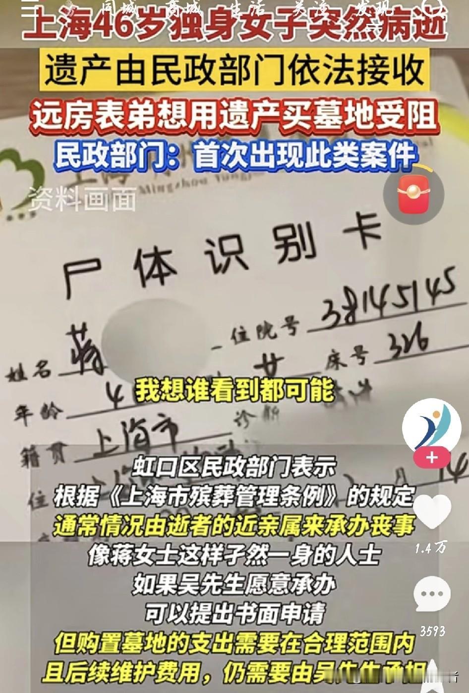 自己的钱不能用来处理后事 上海一独居女性46岁因突发脑溢血离世,父母因早逝,未结婚生子,今年10月因突发脑溢血被送医救治,陷入昏迷状态无法动用自己的储蓄的资金支付医疗费,远房表弟吴先生垫钱出力,上下张罗。按法律规定,吴先生不能继承遗产。 12月14日不幸离世,因其无近亲属,蒋女士的遗产依法由民政部门接受。吴先生想用蒋女士遗产为她举办追思会并购买墓地,缺遇到难题。民政部门表示,根据《上海市殡葬管理条例》的规定,通常情况由逝者的近亲属来承办丧事,像蒋女士这样孑然一身的人士,如果吴先生愿意承办可以提出书面申请,但购置墓地的支出需要在合理范围内,且后续维护费用,扔需要由吴先生承担。 通过这事你领悟到了什么?第一,人这一生千万别独身,否则死后连个安葬的人都没有。第二,如果你万不得已成了独身,千万别存钱,因为你的钱救不了你的命,死后还被充公。脑溢血死亡 临终财产继承 丧葬费办理流程