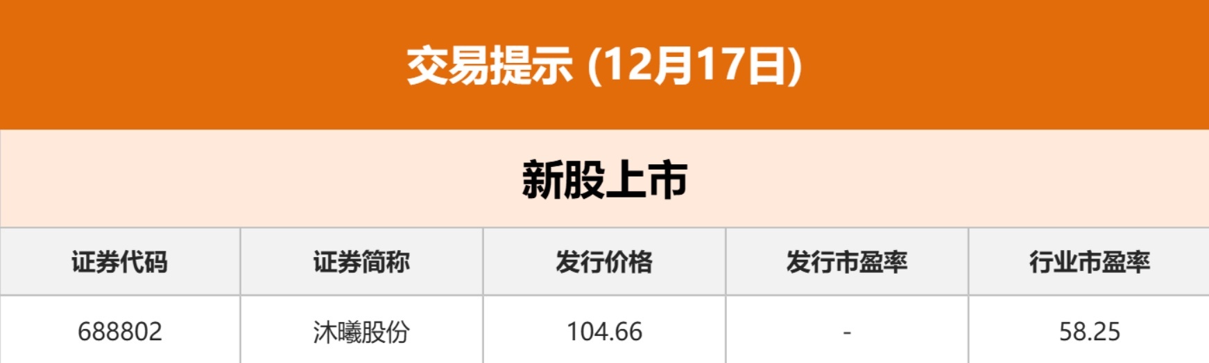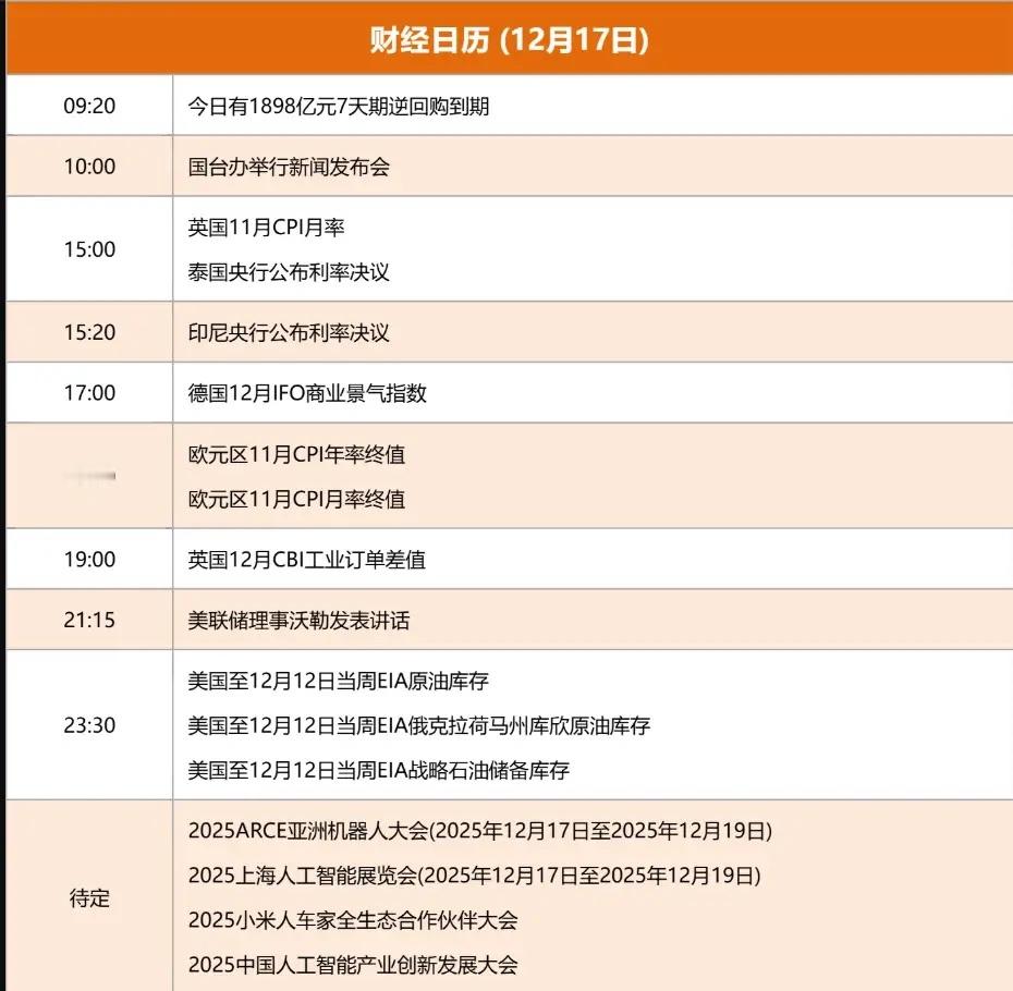 12.17股市早知道:1、外盘汇总:小跌小涨,如图一。 2、交易提示:如图二。 3、财经日历:如图三。 4、三大指数:1)大盘:继续看涨2)创指:继续看涨3)科创50:继续看涨 5、重要新闻:1)人社部:坚持把稳就业作为第一位的任务,推动增加劳动者报酬;2)商务部:对原产于欧盟的进口猪肉及副产品征收反倾销税,裁定税率为4.9%-19.8%;3)中央财办:扩大内需是明年排在首位的重点任务;4)国家能源局:深入开展2026年电力领域综合监管。 6、市场动态:1)广州发布《美丽广州建设规划纲要(2025—2035年);2)前360高级副总裁玉红,对360集团创始人周鸿祎发起猛烈攻击,称其涉嫌“财务造假”。 7、公司公告:1)超声电子:印制板产品可用于低轨卫星及低空经济无人机;2)多伦科技:通过星芯基金持有众擎机器人1.57%股份;3)中兴通讯:深度参与全球6G标准化进程;4)联合精密:拟1.94亿元收购迈特航空51%股权;5)航天信息:公司目前主营业务不涉及商业航天。