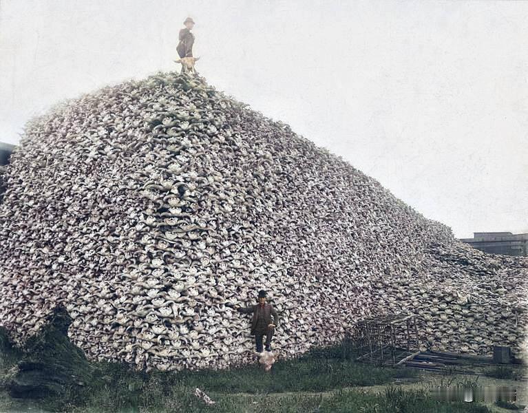 这张照片拍摄于 1892 年左右,展示了堆积如山的美洲野牛头骨,是 19 世纪末美洲野牛被大规模屠杀的标志性图像。 这张照片拍摄于密歇根州鲁日维尔(Rougeville, Michigan)的密歇根碳工厂(Michigan Carbon Works)外,当时这些头骨正等待被加工。 在 18 世纪末,北美大陆约有 3000 万到 6000 万头野牛。到拍摄这张照片时,野生野牛的数量已锐减到仅剩几百头。大部分屠杀发生在 1850 年代至 1870 年代末。 大规模捕杀野牛的原因包括获取皮毛、肉和骨头,同时也是美国政府一项旨在剥夺印第安部落重要自然资源、削弱其抵抗的蓄意战略。 这些头骨被收集并运往东部工厂,磨成骨粉,用作肥料、骨炭滤清器、胶水甚至高级瓷器的原料。 野牛的濒临灭绝给当地生态系统和依赖野牛生存的印第安部落的文化和生活方式带来了灾难性的影响。幸运的是,后来的保护工作使野牛种群数量得以恢复,如今估计约有 50 万头野牛生活在美国。 这张照片揭示了美国西进运动中一段黑暗的历史,警示着人类过度开发的后果。