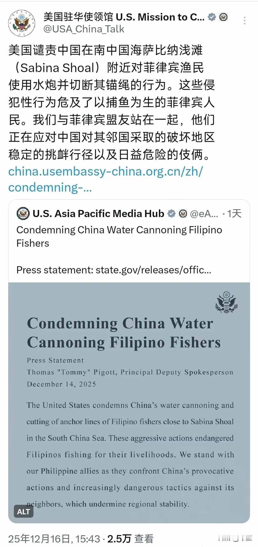 美国这波谴责,装得也太假了 美国谴责中国在萨比纳浅滩的执法行动,说得冠冕堂皇,那我倒想问问:要是有外国船只天天闯美国领海非法作业,美国会只用水炮驱离、切个锚绳? 怕不是直接军舰围堵、扣押船只,甚至开火警告吧?当年古巴渔船靠近美国海域,美国海警的手段可比这狠多了。 自家搞霸权执法时理直气壮,中国依法维护领土主权,就成了“挑衅”?这种双重标准的嘴脸,实在难看。说到底,美国哪是关心菲渔民,不过是借题发挥搅乱南海罢了,真要换它遇上这事儿,做法只会更狠!