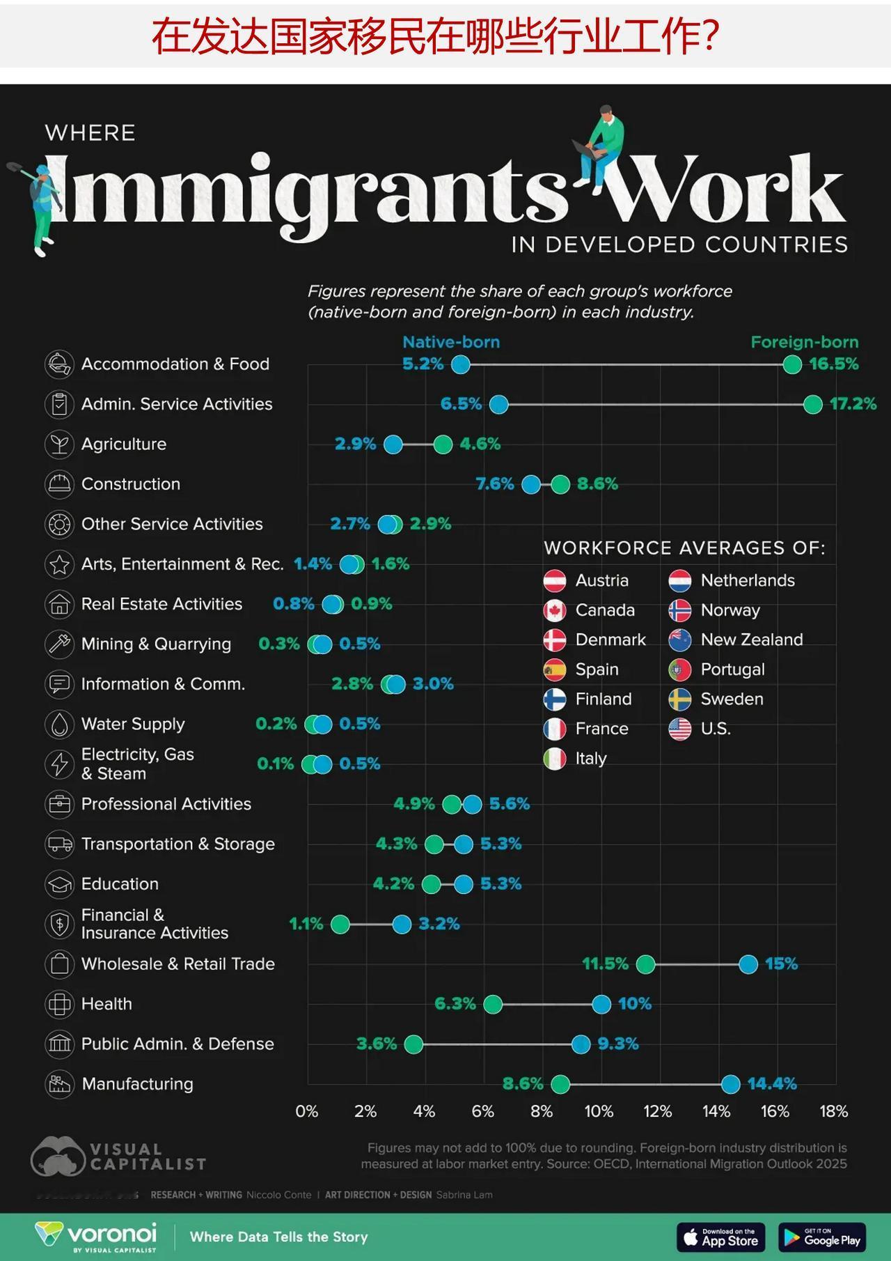 在发达国家,哪些行业最依赖海外移民? 移民在发达国家的劳动力市场中发挥着至关重要的作用,但他们的就业模式与本国出生的劳动者有着显著的不同。这一图表详细展示了在经合组织成员国中,外国出生的劳动者的工作分布情况。 此次图表所依据的数据来自经合组织的《2025 年国际移民展望》报告。该报告对多个发达国家的各行业中外国出生劳动者与本国出生劳动者所占比例进行了统计。 ——移民最为集中的行业 酒店业和行政服务行业在吸纳移民方面表现尤为突出,其中住宿和餐饮行业移民占比超过 16%,行政服务行业占比达 17%。这些行业通常依赖灵活且季节性的劳动力,因此成为新移民的进入点。 建筑行业也显示出一定程度的移民集中现象,这反映出长期以来对熟练和半熟练劳动力的需求。综合来看,这些行业凸显了移民在哪些领域对经济活动起到了显著的促进作用。 ——由本地出生的劳动者主导的行业 公共管理、医疗保健和制造业领域对本土出生的工人的优势最为明显。这些行业通常需要本国颁发的证书、安全审查资格,或者漫长的培训流程。 制造业同样面临着长期存在的劳动力短缺问题,但其对移民工人的准入门槛仍然相对较高。这一结果造成了结构性的差距,使得移民难以参与到一些规模最大的就业领域中。 ——中性或平衡型行业 有少数几个行业,如房地产、艺术与娱乐业以及其他服务行业,在外籍员工与本土员工的占比方面几乎不存在差异。这些行业可能提供了更灵活的入职途径,或者包含了一些小型企业职位和自由职业岗位。