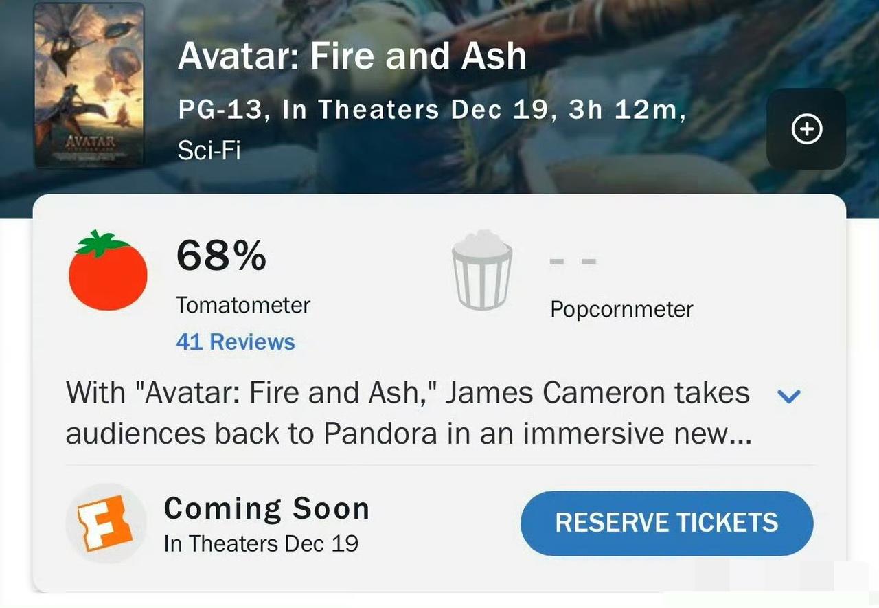 网传阿凡达3遇冷,预售不达预期。 阿凡达3口碑解禁了,烂番茄68%,三部里口碑最差的,加上在内地200多一张的票价,遇冷也正常吧,这个太贵了,一家人买个票再买点饮料爆米花小1000块就没了[泪奔]