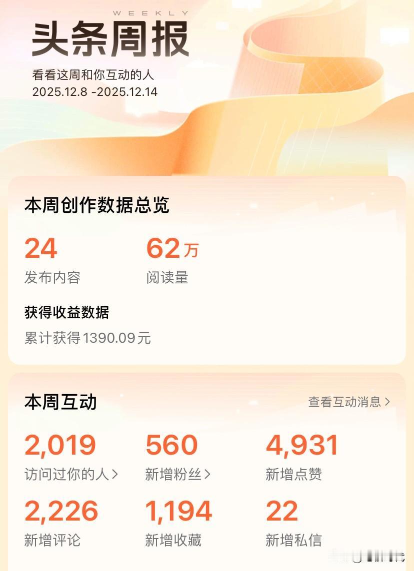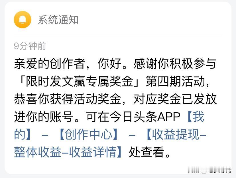 没想到啊!这么快!500元到手了!限时发文赢专属奖金第四期收益不期而至。果真没辜负,又添一个遗憾。 为了冲刺拿到这次活动最高奖励,上周努力了6天,突破50万阅读量。 看了头条周报数据,总共发了24篇,阅读量达62万,平均每篇不到三万,累计收益1300多。 24篇,对于一些创作者恐怕一天究完成,对于我于已是极限了。 这次数据是让我想不到的,上周第一篇微头条还在吐槽被限流两个月,第四期期限时活动邀请,对我只是摆设,还是给需要的创作者。 吐槽完发现限流解除了,就赶紧写了一篇文章发布,结果给了大惊喜,第一篇文章就有二十多万阅读量。接着就铆着劲闯关。 遗憾的是,第五期限时活动没邀请我了,不知道是什么原因,之前限流还被邀请了。 果真没有激励,就没有动力,到现在还没发一篇文章。 这种激励活动太香了,500大洋,又可以存进我的小金库了。