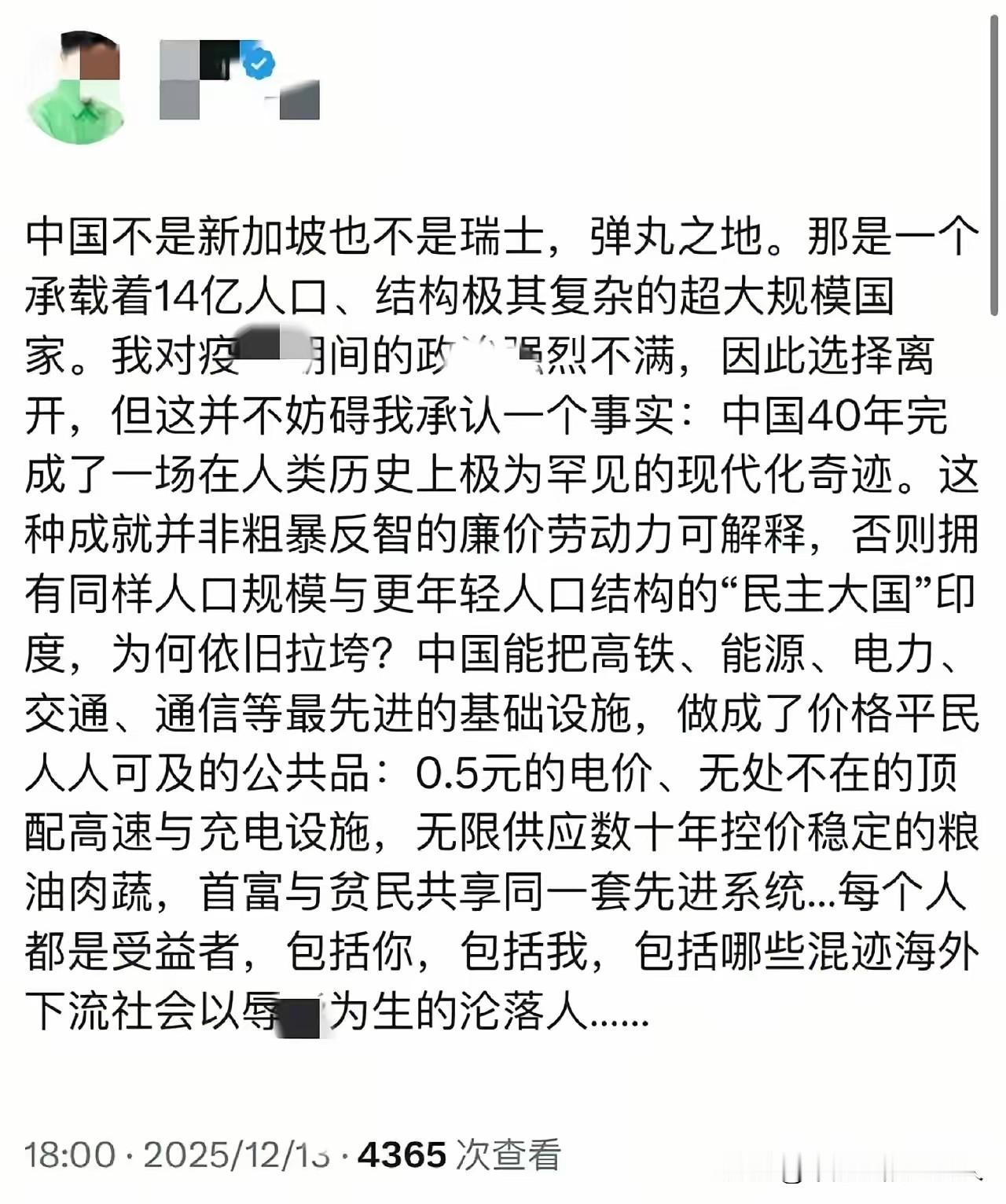 “没有对比,就没有伤害”,这句话永远是颠扑不破的真理! 有时候,不妨让那些恨国党走出国门,去国外亲身体验一番当地的生活,再做个对比。倘若他们还有一丝良心,还能秉持最起码的客观公正,那么,不用我们与之争论,他们也无法否认中国目前所取得的伟大成就,必然会承认当下的中国,尤其是对于普通老百姓而言,就是有史以来最好的时代,没有之一。 当然,这世上本就没有十全十美的国家,哪怕是很多恨国党心中的“天堂”——美国。不过,我们毫不担忧,因为我们始终在不断改进、持续发展,未来必将更加美好!