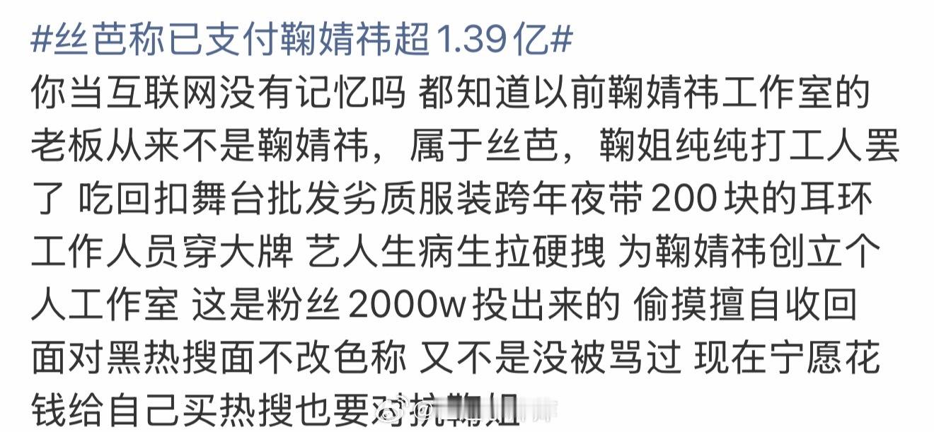 月薪5000赚1.3亿要2166年2167年前是…西汉建议粉丝别用“高级打工人”给她卖惨了打工人不配啊丝芭曾拒付鞠婧祎发型师费用丝芭说鞠婧祎经常报销和工作无关支出