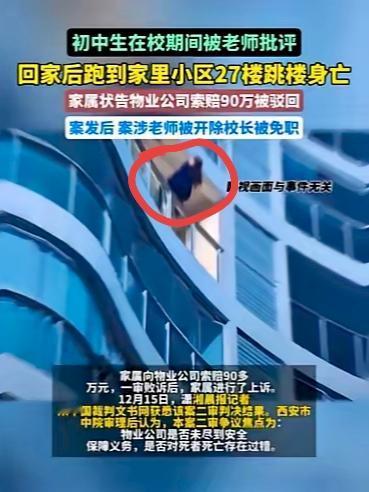 悲剧了!近日西安一学生,在学校被老师批评,他默默的走进自家小区27楼,没有犹豫的跳了下去,坠楼身亡? 此事发生后,老师被开除,校长也因此事被免职,小区物业赔了90万。 家长实在想不通,老师骂孩子批评的有多过分,才使自己的孩子,做出了这样的决定,失去了自己的性命! 而物业更是不负责任,,竟然在27楼走廊里放了4块转头,没有这四块转,孩子根本无法攀登走廊窗户,这4块转头却成了孩子的垫脚石。 家长说,如果!老师不批评自己的孩子那么过分,自己的孩子也不会失去自己的生命, 如果物业,不放那4块砖头,悲剧也不会发生! 可网友的说法却截然不同!有网友表示, 学校物业都没有责任,,责任只有一个,那就是小孩自己,老师不能批评学生那教育的意义何在? 开除老师让学校物业出钱完全没有道理。家教及自身的素质是重要的。 如果非要追究其他人,那就是他的父母,其他不相干的人,都没有责任! 对于这件事你们是怎么看的?