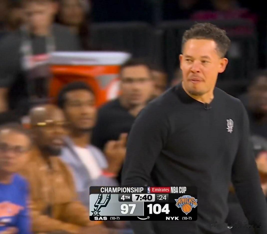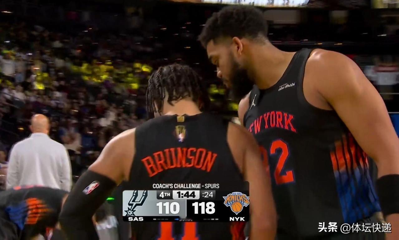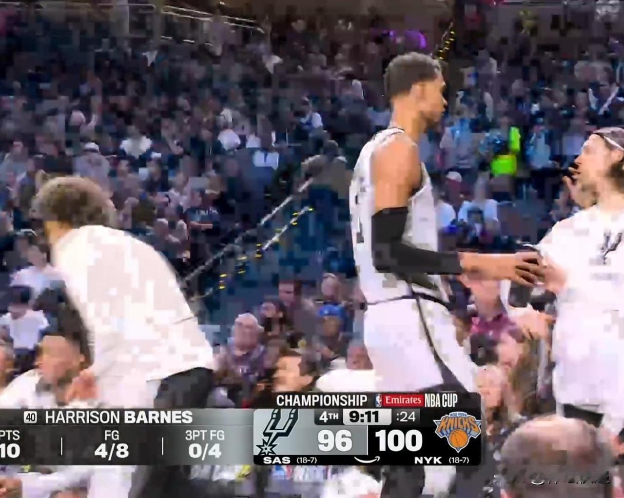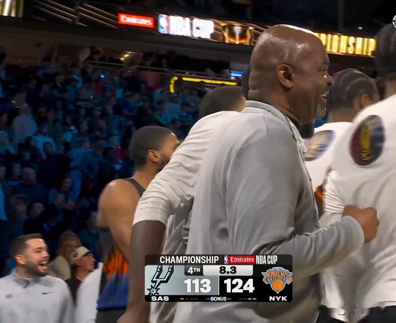 NBA杯决赛纽约尼克斯战胜马刺夺得冠军。上半场场面波澜不惊,双方分差不大,各项数据接近。马刺以2分领先。下半场场上风云突变。第三节开局马刺不断拉大分差,一度来到两位数。尼克斯奋力追赶,在三节结束前将分差缩小到5分。第四节开局尼克斯连下8分,将比分反超,马刺叫暂停。暂停回来,马刺进攻效率不高。纽约尼克斯一直保持5分左右的优势。最后5分钟,文班亚马登场,双方进入最后决战。追分阶段马刺多次打铁,慢慢失去机会。尼克斯最终守住胜利。全场比赛结束,纽约尼克斯124:113战胜马刺,夺得NBA杯赛冠军。