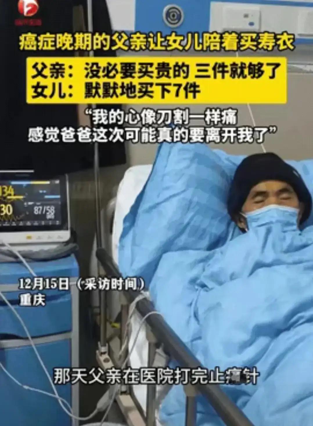 “泪目了!”重庆,一父亲肝癌晚期,在医院打完止痛针后,突然提出,让女儿陪他出去买寿衣,不料,到店里之后父亲说:“没必要买贵的,买3件就够了!” 女儿听见这话,脚步都顿了一下。扶着父亲的手不自觉收紧,指尖碰着父亲枯瘦的胳膊,那点单薄的温度,让她喉咙里像堵了团棉花。 寿衣店开在老街区的巷口,门面不大,货架上整齐叠放着各色素净的衣物,布料摸着厚实却不张扬。老板见是重病老人,特意调低了收音机的音量,递过来两把竹椅:“叔叔阿姨坐,慢慢选,都是纯棉的,穿着舒服。” 父亲摆摆手,没坐,扶着货架慢慢挪动,目光扫过那些绣着简单花纹的寿衣,径直停在最靠边的一排:“就这个吧,深蓝色的,耐脏。” 女儿赶紧上前:“爸,咱看看里面的,那件带暗纹的摸着更软和。” 父亲摇摇头,伸手摸了摸深蓝色的布料,粗糙的手指在布面上轻轻蹭着:“不用,这个就好,布料厚实,死后穿着凉不着。” 他转头问老板:“这三件多少钱?上衣、裤子、外套,凑一套就行。” 老板报了价,女儿刚想开口说“选贵点的”,就被父亲打断:“就这个价,合适,不用再看了。” 女儿的眼泪在眼眶里打转,强忍着没掉下来。她想起小时候,父亲总穿着洗得发白的蓝布褂子,袖口磨破了就缝上补丁,却从来没让她受过委屈。她上大学那年,想要一台笔记本电脑,父亲没犹豫就答应了,后来她才知道,父亲为了凑钱,连着三个月在工地上打夜工,累得腰都直不起来。如今父亲病重,连买寿衣都要精打细算,怕花多了她的钱。 “爸,咱买套好点的,也花不了多少。”女儿哽咽着,声音都在发抖。父亲转头看着她,脸上露出一丝笑意,眼神里满是疼惜:“傻闺女,花那冤枉钱干啥?人死了,穿再好也没用,不如省下来,你以后过日子还得花钱。” 他顿了顿,咳嗽了两声,扶着货架喘了口气,又说:“我这病折腾这么久,已经花了你不少钱,不能再给你添负担了。” 老板在一旁看着,悄悄递过来一包纸巾,低声对女儿说:“姑娘,你爸是疼你啊,这种纯棉的其实挺好,透气吸汗,老人走得也舒坦。” 父亲听见了,点点头:“老板说得对,实用就行。” 他拿起那件深蓝色的上衣,在自己身上比划了一下:“大小差不多,就它了。” 女儿看着父亲枯瘦的身形,以前那件能裹住他宽厚肩膀的衣服,现在看着空荡荡的,心里更疼了。 付完钱,老板把寿衣叠好,装进一个素色的布包里。父亲接过布包,小心翼翼地抱在怀里,像是抱着什么珍宝。走出寿衣店,夕阳把父女俩的影子拉得很长,父亲的脚步有些蹒跚,每走几步就要停下来喘口气,却一直紧紧抱着那个布包,不肯让女儿帮忙。 “爸,我帮你抱吧。”女儿伸手想去接,父亲却躲开了:“不用,我自己来,这东西得我自己拿着才放心。” 他抬头看了看天,轻声说:“以后我走了,你别太难过,好好过日子,照顾好自己。” 女儿再也忍不住,眼泪掉了下来,砸在地上,她哽咽着说:“爸,你别这么说,你会好起来的。” 父亲没接话,只是慢慢往前走,嘴里哼起了以前常唱的老歌,调子有些跑调,却透着一股释然。女儿扶着他,能感觉到他胳膊上的肌肉在微微颤抖,知道他是强忍着疼痛,却不想让自己担心。她想起这些日子,父亲每次疼得厉害,都只是咬着牙,实在忍不住了才去打止痛针,从来没在她面前抱怨过一句,总是笑着说“没事,我能扛住”。 回到医院,父亲把布包放在床头柜里,仔细叠好,又叮嘱女儿:“以后我走了,就穿这一套,别再花钱买别的了。” 女儿含泪点头,心里却像被刀割一样。她知道,父亲不是不爱穿好的,只是把所有的好都留给了她,自己却一辈子节俭,连最后的寿衣都要选最便宜的。 后来,父亲还是走了,走的时候穿着那套深蓝色的寿衣,脸上带着安详的笑容。女儿整理父亲的遗物时,发现那个布包里除了寿衣,还有一张纸条,上面是父亲歪歪扭扭的字迹:“闺女,我走了以后,你要好好吃饭,好好工作,找个对你好的人,别惦记我,我在那边会好好的。” 女儿抱着纸条,哭得撕心裂肺,她知道,父亲的爱,从来都藏在这些平凡的细节里,藏在他的节俭里,藏在他对她的牵挂里。 在这个世界上,最伟大的爱,从来都不是轰轰烈烈的誓言,而是这种润物细无声的付出。父亲用他的一生,诠释了什么是父爱如山,哪怕到了生命的最后一刻,心里想的还是女儿的未来。这种平凡而深沉的爱,足以温暖女儿的一生,也让我们明白,父母的爱,从来都藏在最朴素的细节里,值得我们用一辈子去珍惜。 各位读者你们怎么看?欢迎在评论区讨论。