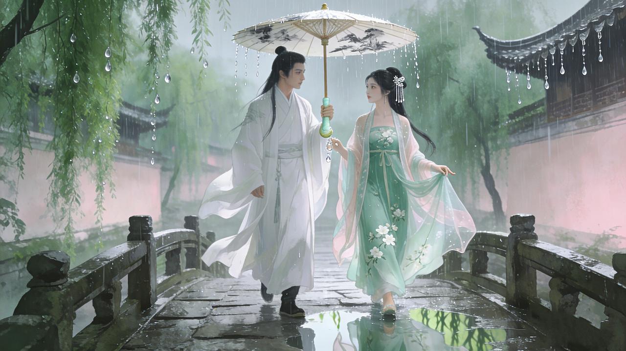 雨洗青锋凝露,烟萦绣带沾香。 踏过石桥穿柳巷,拂尽檐花过粉墙。 衣痕带晓光。 笑弃浮名如絮,闲抛俗念如霜。 娇柔侠女却伴我,撑伞横舟渡楚江。 客栈品琼浆。