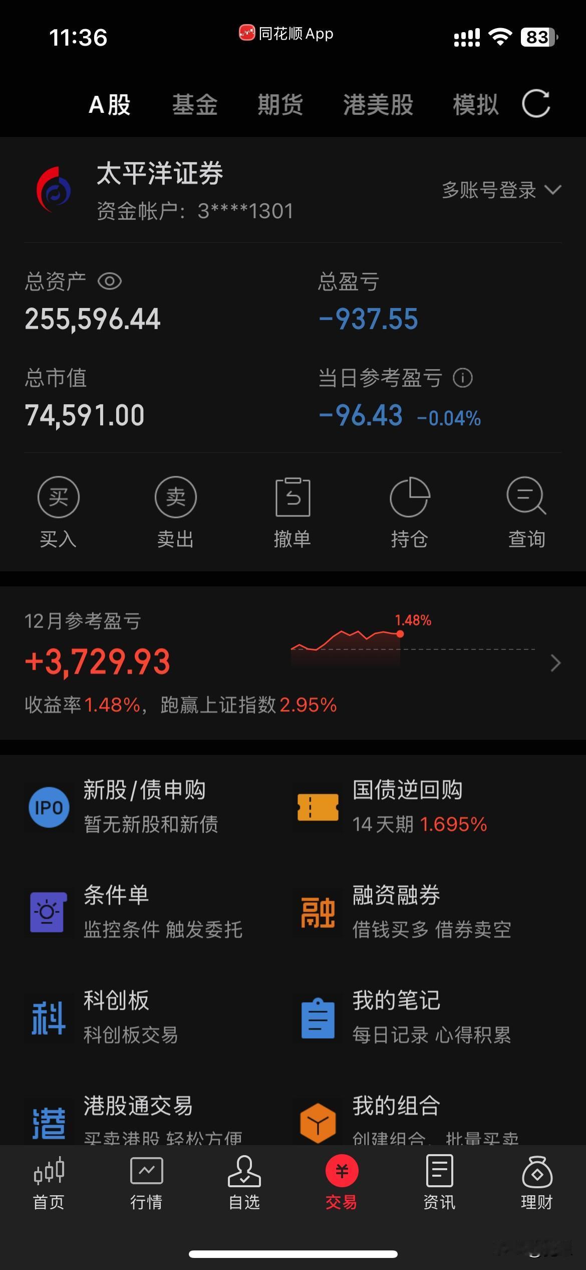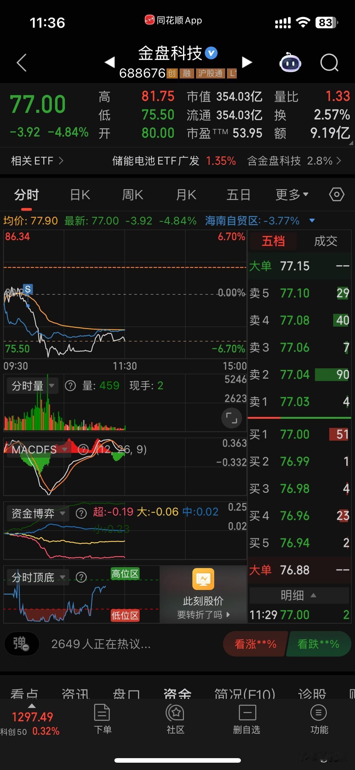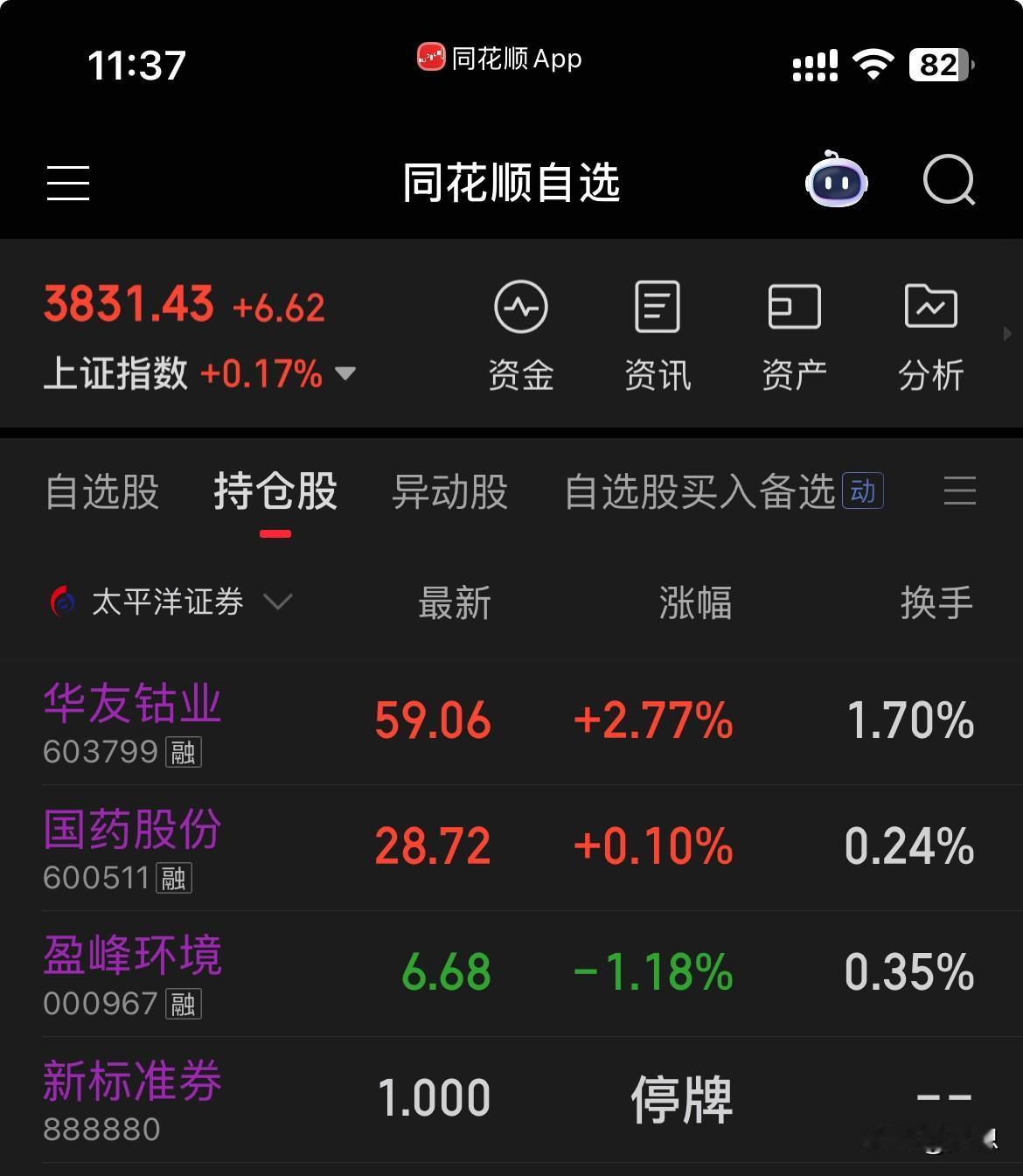 大盘上午一波下杀后止稳横盘震荡。今天科技股有所表现,这两天热点板块零售开始调整。我的金盘早盘略为红盘后一路下杀,好在我看到海南板块重挫后设了止损位🏃了。宙邦也在止损位被洗掉了。低位加仓了盈峰。上午亏损不到1百。上午大盘继续缩量,下午又是凶多吉少。如果下位大盘回落,准备尾盘接点货回来。