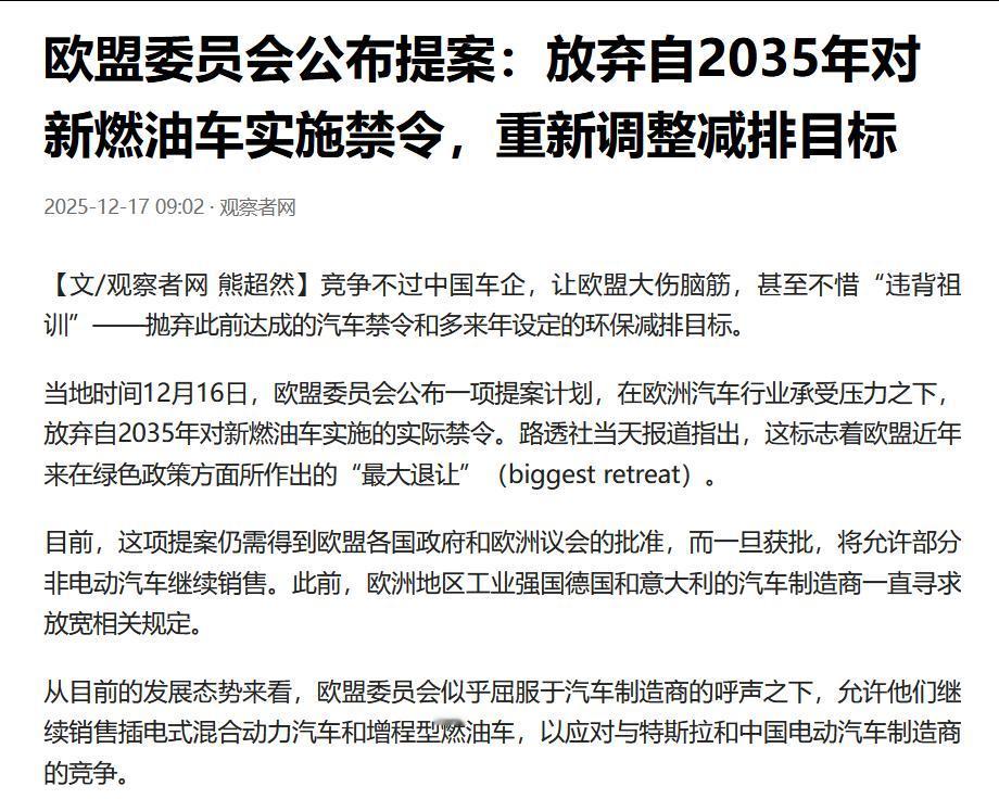 竞争不过中国车企,欧盟委员会公布提案:放弃自2035年对新燃油车实施禁令,重新调整减排目标。 当地时间12月16日,欧盟委员会公布一项提案计划,在欧洲汽车行业承受压力之下,放弃自2035年对新燃油车实施的实际禁令。路透社当天报道指出,这标志着欧盟近年来在绿色政策方面所作出的“最大退让” 个人评论:丁仲礼院士的话含金量还在提升。早就把西方的虚假看透了。 欧洲能舒舒服服赚钱的时候,搞搞环保让自己显得道德上很高尚,还能用环保的条条框框打压中国等竞争对手,这样的环保为什么不搞?当环保不能再打压竞争对手,还会限制自己的手脚损害自己的利益的时候,对欧洲来说环保就该滚一边去。 欧盟打算推翻之前自己对气候议题的承诺,除了显示西方在这方面的虚伪,也再次验证了西方只是将气候议题,当作能阻碍发展中国家发展的工具。那时,已是工业强国的西方,甚至头脑发热的认为发展中国家在科技方面永远追不上自己;谁知,西方人的阴谋打不过中国人的宏大的阳谋;中国这么个对绿色经济真下功夫的国家,真干实干,干出了一番享誉世界的成就;尤其绿色科技方面;不仅是反超西方,几乎是碾压西方。不傻的西方人,发现自己设计原本绊他人的绊子,开始绊自己了........ 不如将气候问题淡化 ........ 问题是,欧洲就跟着美国走照样解决不了问题,即便是解禁燃油车,欧洲的车企也不会在欧洲生产了,没有了廉价的俄罗斯油气资源,欧洲的基础工业甚至能源都已经被欧洲给搞得七零八落了,加上高福利高工资低效率高税率,欧洲已经不具备生产工业品的竞争环境了,今后可能欧洲企业会加速往中国转移。