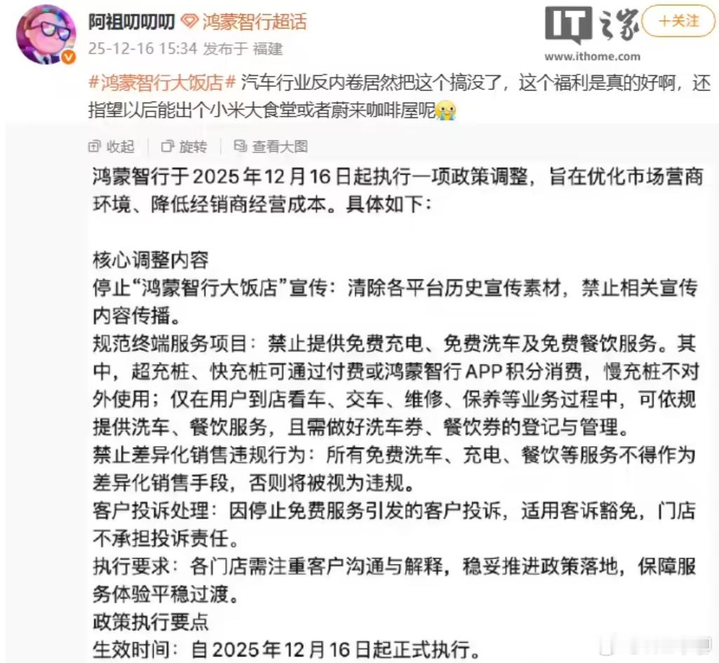 鸿蒙智行停止宣传鸿蒙大饭店 好吧,鸿蒙智行大饭店现在正式宣告取消。说有些鸿蒙智行店,都被一些老年人把羊毛都薅光了。现在有很多老年人都是以买车的名义,在饭点来看车、咨询。然后被邀请……如果不邀请就主动说自己饿了……还是脸皮要厚才能多占便宜啊,以前我去4S店保养,别人说来都来了,不嫌弃的话吃个职工餐,我都不好意思。