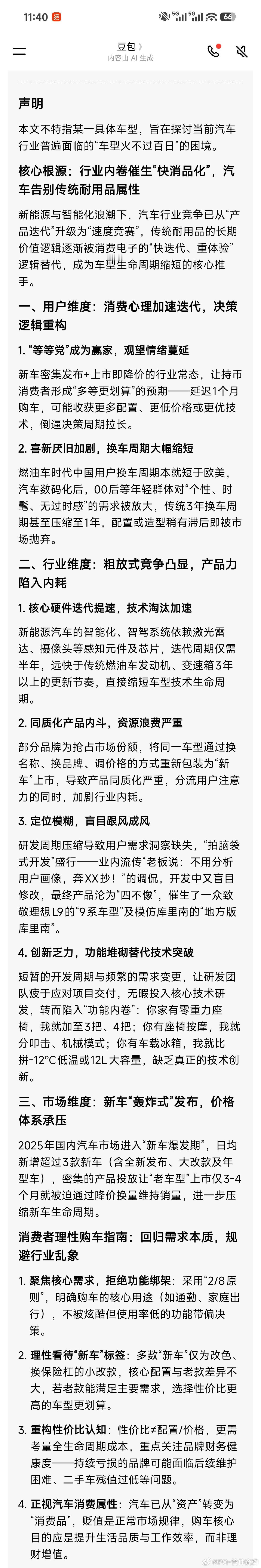 我用小米开源最新大模型和豆包分别润色了如下我写的关于【为什么很多车型火不过百日?】【声明】这里不特指某一款车,而是当前的行业困境为什么很多车型火不过百日?【核心原因】:汽车严重「内卷」,让汽车从「耐用品」变成了「快消品」,也就是汽车工业品向消费电子转变。下面我们分别从用户,汽车行业和市场三个维度聊一聊。1️⃣用户心理变化【等等党胜率大增】因为新车密集,因为热度一过就要以价换量。就促使持币观望的那部分消费者更加的不急,因为多等1个月可能就能买到配置更多,价格更便宜的新车。【喜新厌旧被快速放大】燃油车时代中国平均换车周期就远短于欧美,当汽车数码化后,进一步放大了00后对于个性时髦的需求,配置不过时,造型不时尚,本来3年才换的车,现在甚至缩短至1年。2️⃣行业【核心硬件迭代周期短】新能源依托的智能化和智驾,无论感知元件激光雷达,摄像头还是算力大脑芯片迭代周期以半年记,远远比传统燃油车的发动机变速箱动辄3年的更新周期短。【相似/相同产品分流内斗】某些品牌,为了抢夺市场,某一车型换换名字,换换品牌,换个价格以新车形态上市售卖。【定位模糊】因为研发周期缩短,用户需求洞察基本没有。拍脑袋式车型开发,业内聊天“老板说:分析什么用户画像,奔XX抄!”,开发过程中觉得,不能全抄,得改一改,最终出来的产品就是一个四不像。这也催生了致敬理想L9的一众9系和致敬库里南的一众“地方版库里南”。【创新乏力】开发周期如此短暂,需求变化如此频繁,让研发工程师们疲于应对项目,无暇进行新技术研发。于是,搬运工作大行其道。你家有零重力座椅是吧?我来2把。哦,那我来3把,4把。。你家有座椅按摩?我来一个叩击那我一个机械你家有冰箱?我来一个-12度的哦,那我来一个12L的等等3️⃣市场当前国内汽车进入「新车轰炸」,尤其是2025年每天有超过3款新车,包含全新发布/大改款和年型。“老车型”被迫上市后3-4个月就开始以价换量。作为消费者,我们如何理性购车呢?1️⃣抓主要矛盾想清楚核心需求是什么,不要被那些炫酷的功能带偏,采用2/8原则。2️⃣理性看待“新车”很多的新车发布,只是为了造势,实质上和老款没有大的变化。因为老款关注度不够,销量不好,所以就改了个颜色,改了个保险杠,重新上市。老款满足主要需求后,购买一个性价比更高的车何乐而不为呢。3️⃣重新理解性价比性价比不仅仅只是配置/价格,是整个实用周期的成本。要格外关注哪些财务不健康的品牌,持续的亏损可能导致后续车辆维护和二手车产值过低问题。4️⃣汽车资产属性下降把汽车看成消费品而非资产,买来就会贬值是正常的市场规律,购买汽车是为了提升生活品质和工作效率,而非理财。PS:图1小米MiMo大模型,图2是豆包(因为不让截长图,我放到文档里截的)