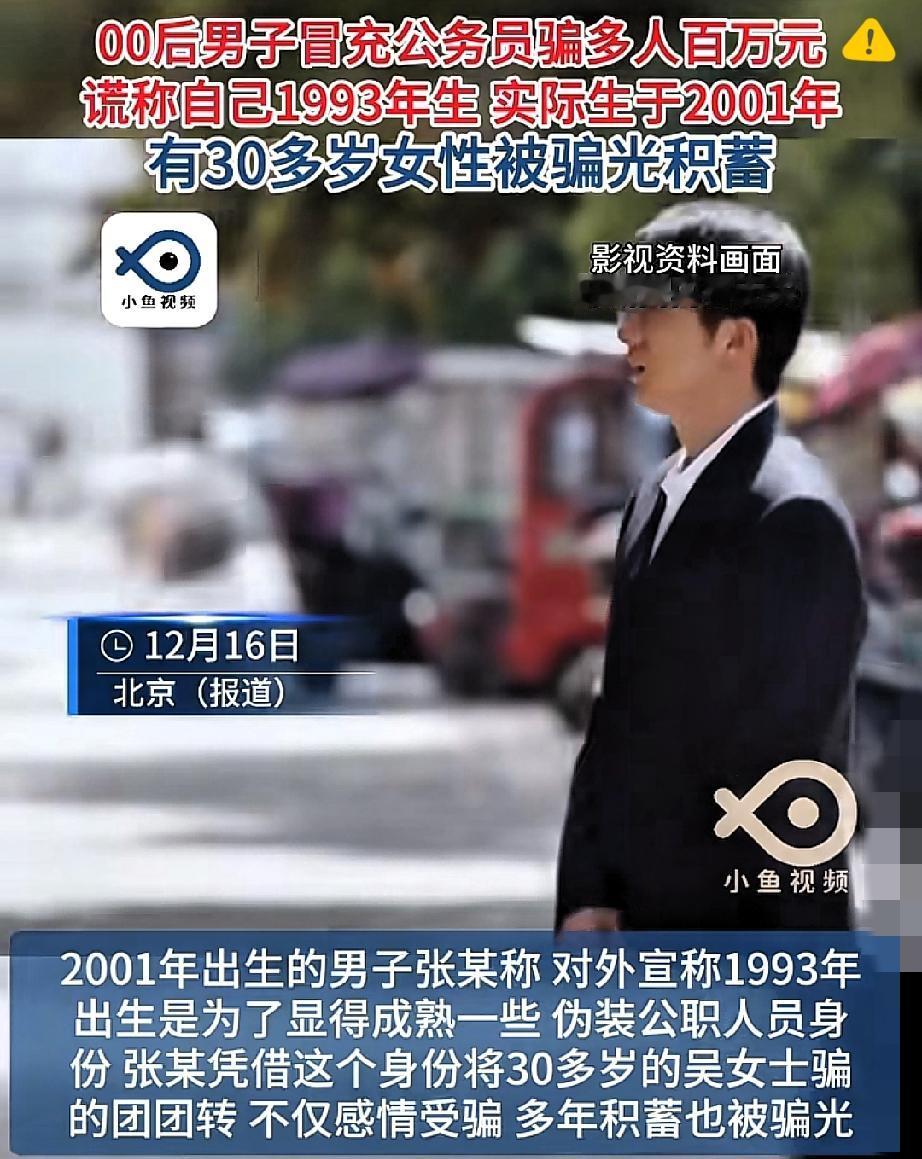 24岁的00后装90后公务员,打车到机关单位门口假装下班,居然骗了四名女性近百万! 这哪里是靠演技,分明是摸透了不少人对“体制内光环”的盲目迷信。 他改大十岁装成熟,用“恋爱承诺”“打点关系”当借口要钱,受害者们掏光积蓄,等来的只有失联和骗局败露。 其实这类套路一点不新鲜,可怕的是有人总觉得“公务员”标签就等于靠谱,把身份当人品的保证书。 真正的安全感从不是虚构的头衔给的,而是涉及金钱时的清醒和谨慎。 那些张口就要“打点费”、靠身份画饼的,大概率是骗子。 你身边有人被类似身份标签迷惑过吗?快来评论区说说你的看法~