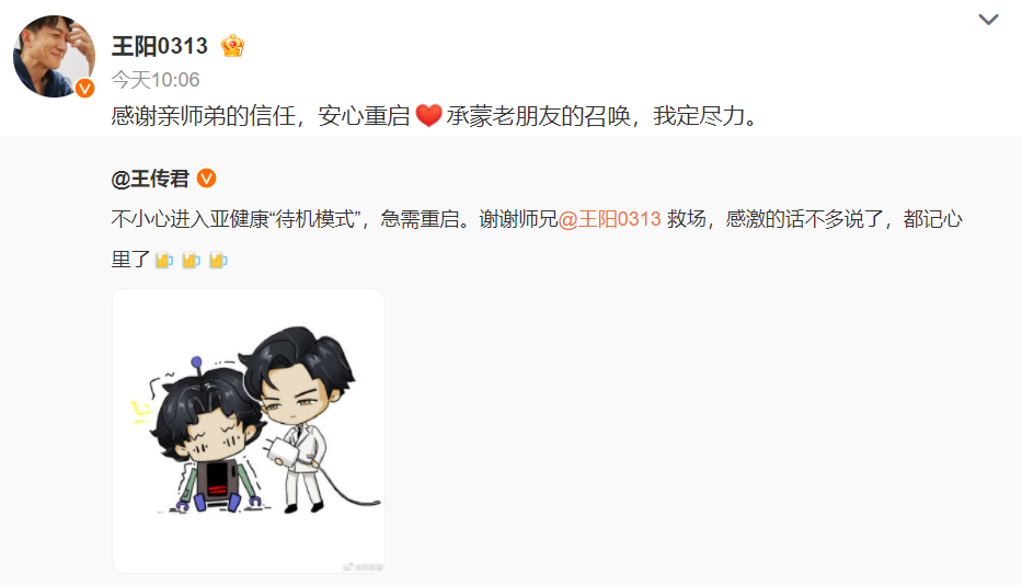 【#王传君因健康问题退出千里江山图#剧组,发文感谢王阳紧急救场】#王阳救场王传君千里江山图# 12月17日,演员发文宣布因健康问题退出《千里江山图》剧组,感谢演员紧急救场。随后王阳转发回应:“感谢亲师弟的信任,安心重启。承蒙老朋友的召唤,我定尽力。”电视剧《千里江山图》官方微博也发文表示:“感谢王阳老师及时救场,入组接演,希望王传君老师满电重启,有缘再会!”