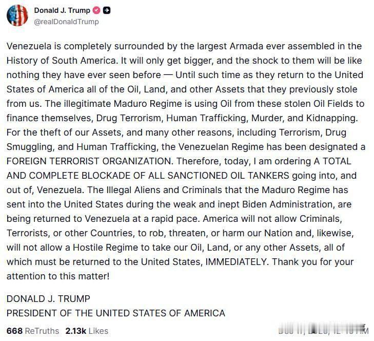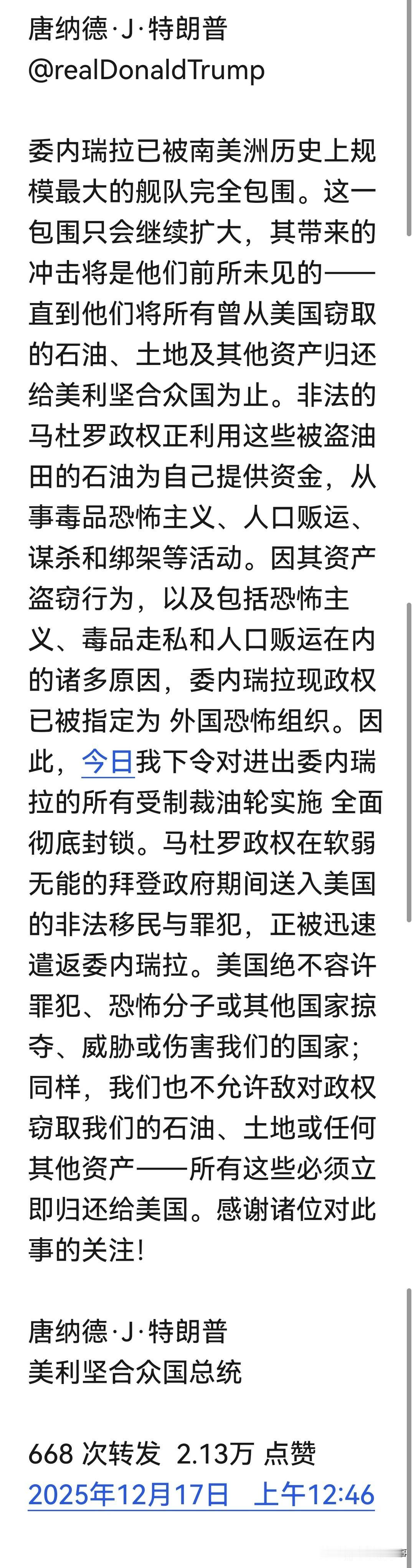 🇺🇸🇻🇪美国总统特朗普宣布对委内瑞拉实施全面海上封锁,原因是马杜罗政府利用从“被盗油田的石油”为自己提供资金,从事“毒品恐怖主义、人口贩卖、谋杀和绑架”等活动。 委内瑞拉战局 委内瑞拉的困境 南美委内瑞拉 委内瑞拉石油战 阿根廷委内瑞拉 守护委内瑞拉 智利委内瑞拉