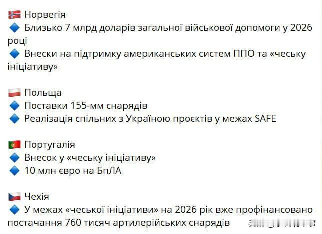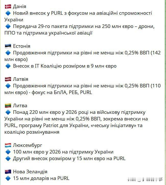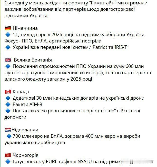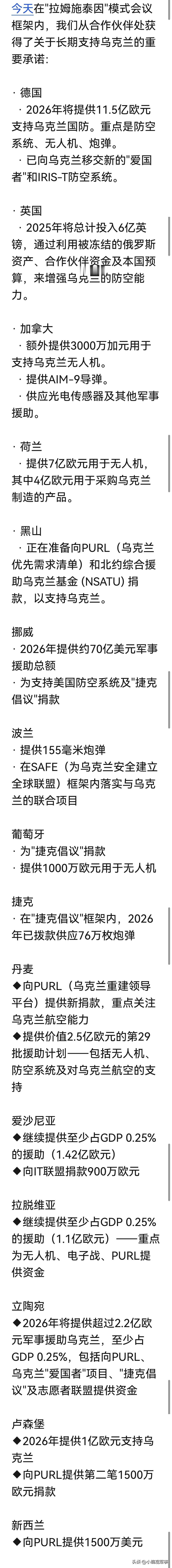 乌克兰国防部长什梅加尔公布了在昨天第32次“拉姆施泰因”会议上15个国家对乌克兰作出的2026年军事援助承诺清单,详细列出了援助金额和物资种类。 从中可以看出,绝大多数援助和资金投入都集中在防空系统和无人机,以及部分炮弹上,乌克兰长期以来几乎不再获得新的装甲车和炮弹供应。 需要指出的是,这些援助并非直接向乌克兰预算注资,因此2026年乌克兰的资金问题至今仍未得到解决。