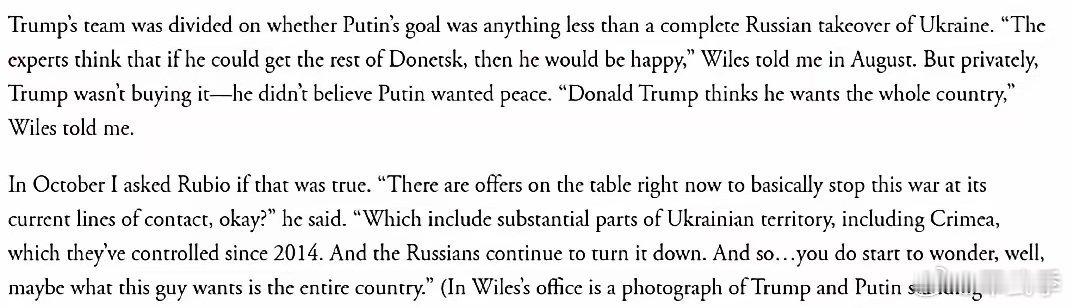 特朗普的幕僚长苏西·威尔斯表示,特朗普私下认为普京在乌克兰的目标是最终想要控制整个国家。