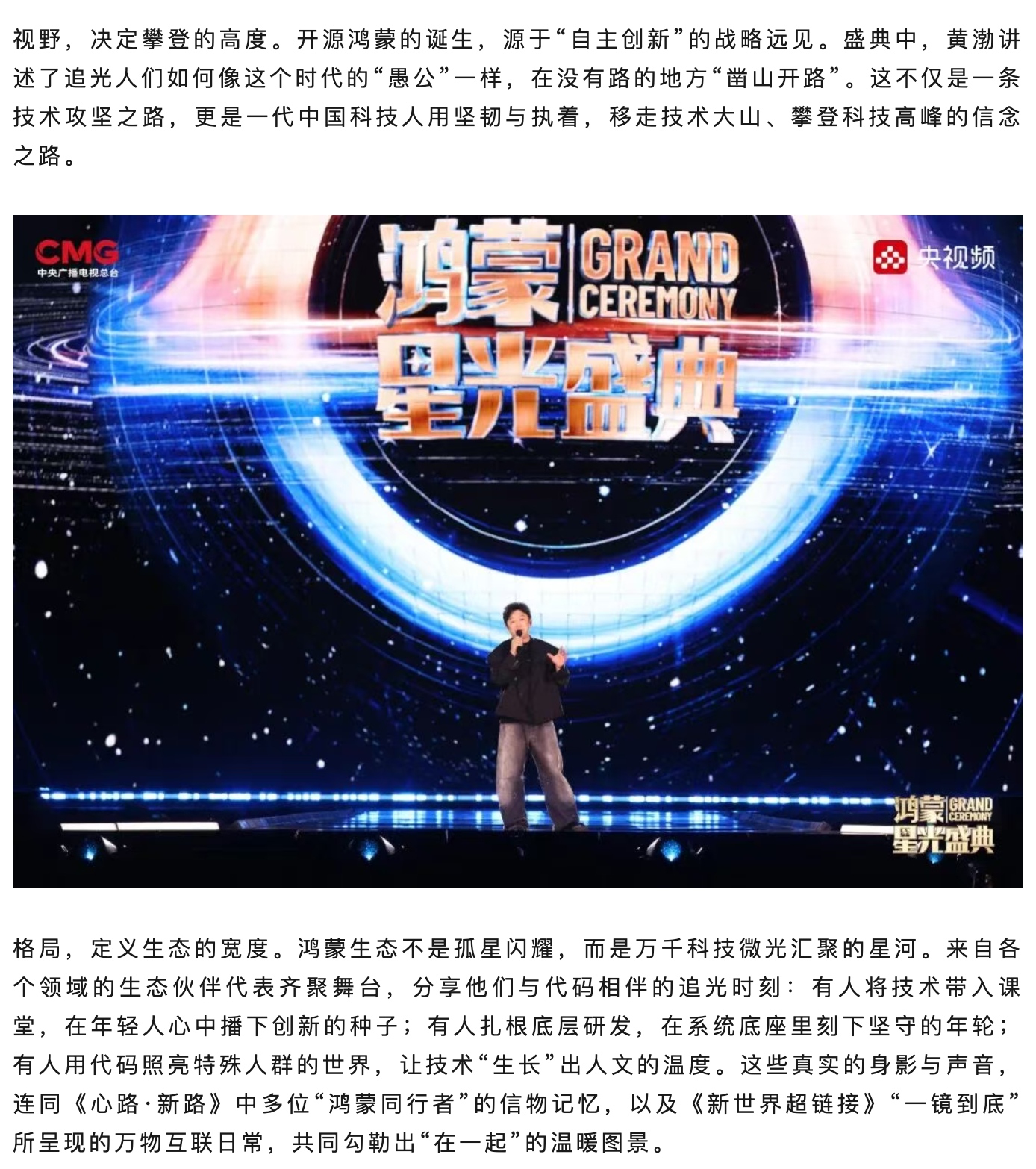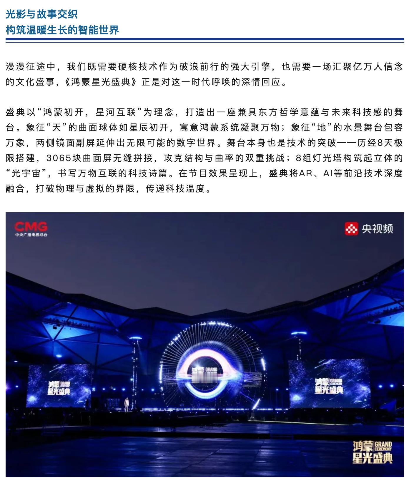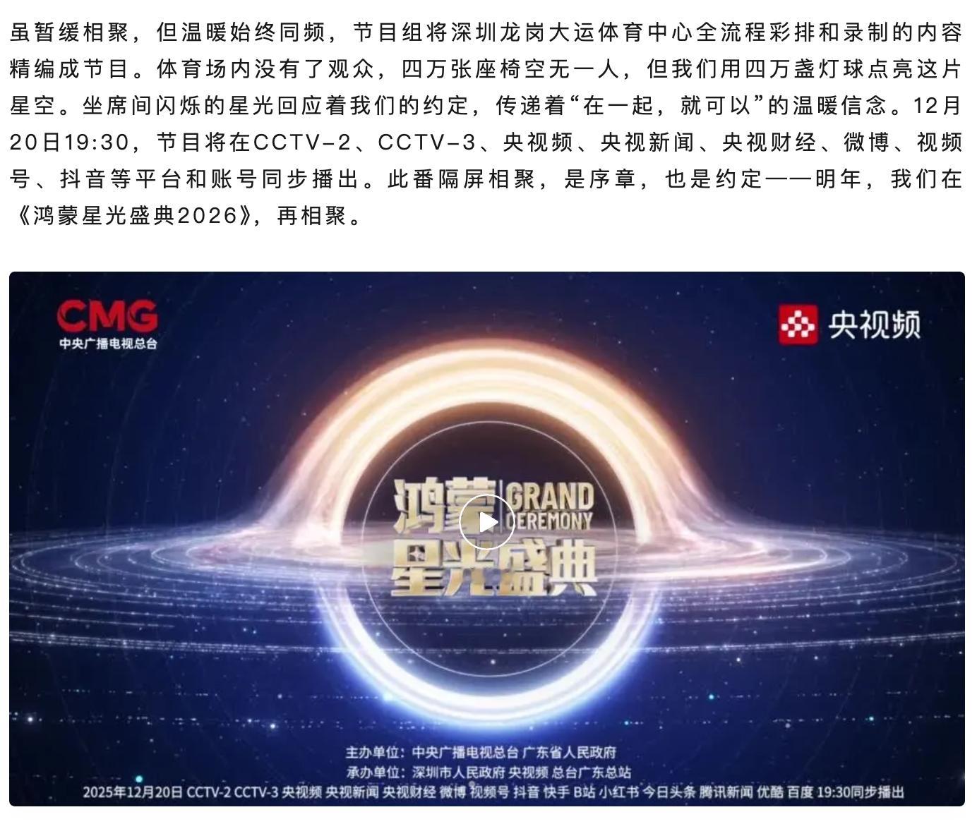 “在一起,就可以”从不是一句口号,而是这个时代最温热的回响。鸿蒙星光盛典延期之后定档12月20号晚7点半,将在CCTV-2、CCTV-3、央视频、央视新闻、央视财经、微博、视频号、抖音等平台和账号同步播出。采用节目播出的形式,节目组将深圳龙岗大运体育中心全流程彩排和录制的内容精编成节目,尽管体育场内没有了观众,但四万张座椅空无一人,用四万盏灯球点亮星空。闪烁的星光回应着约定。20号晚一起见证!央视鸿蒙星光盛典播出定档