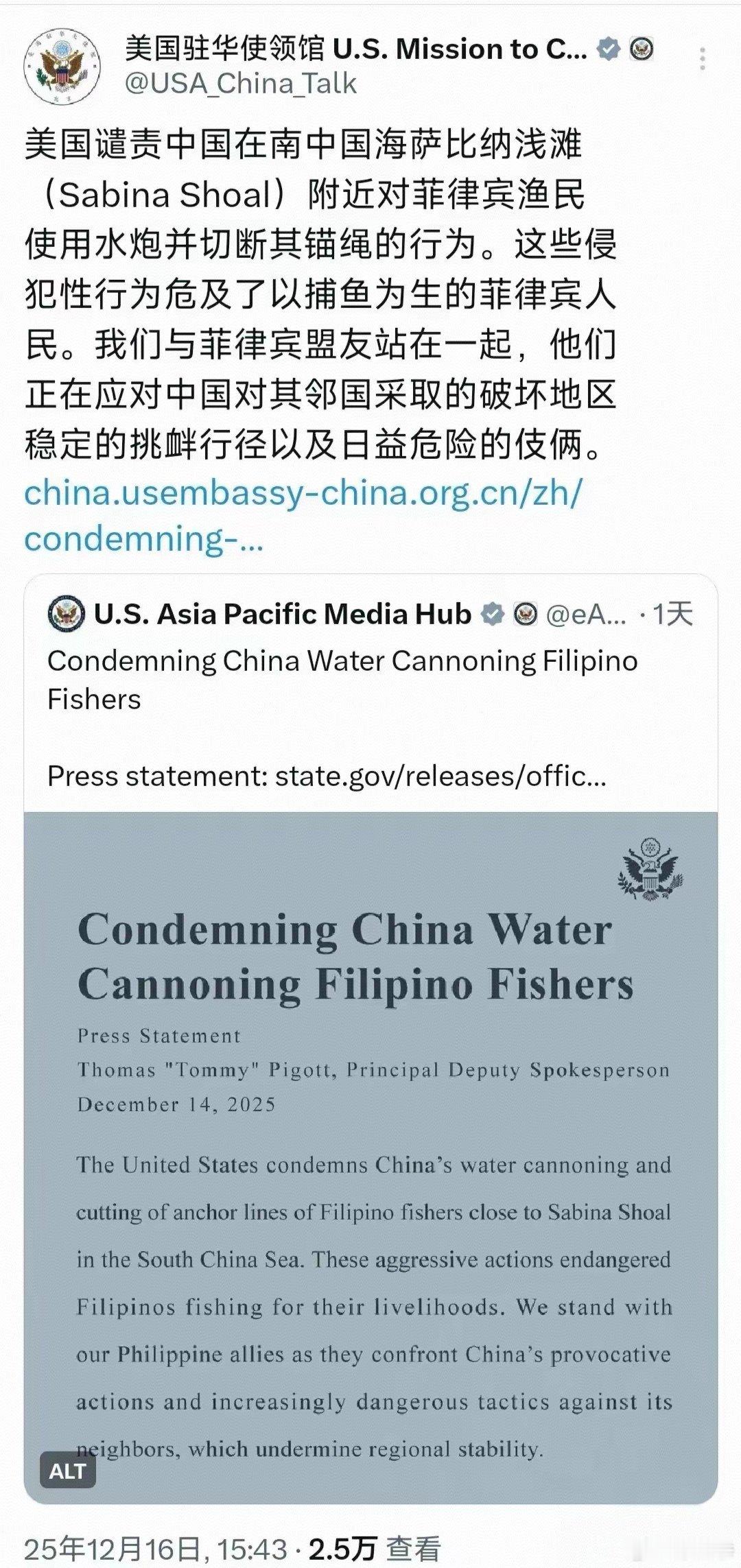 美国力挺菲律宾非法,谴责中国正常维权活动!