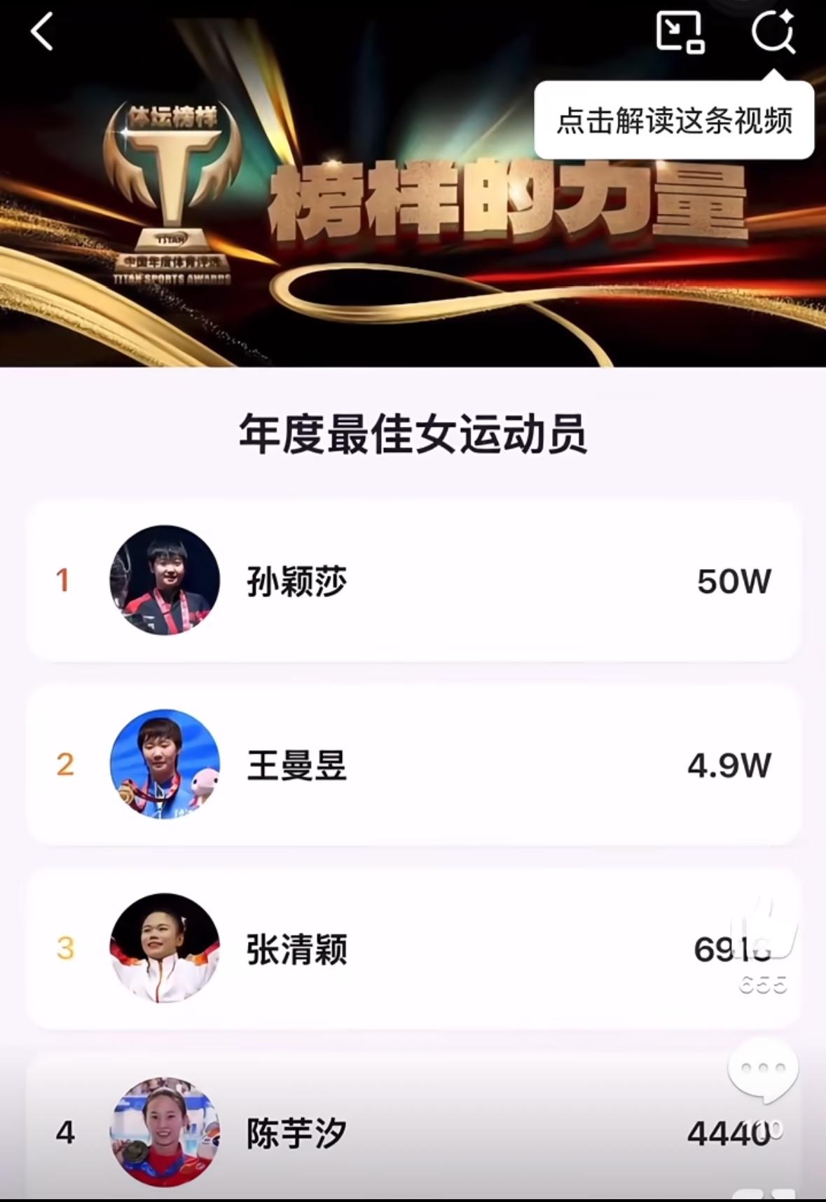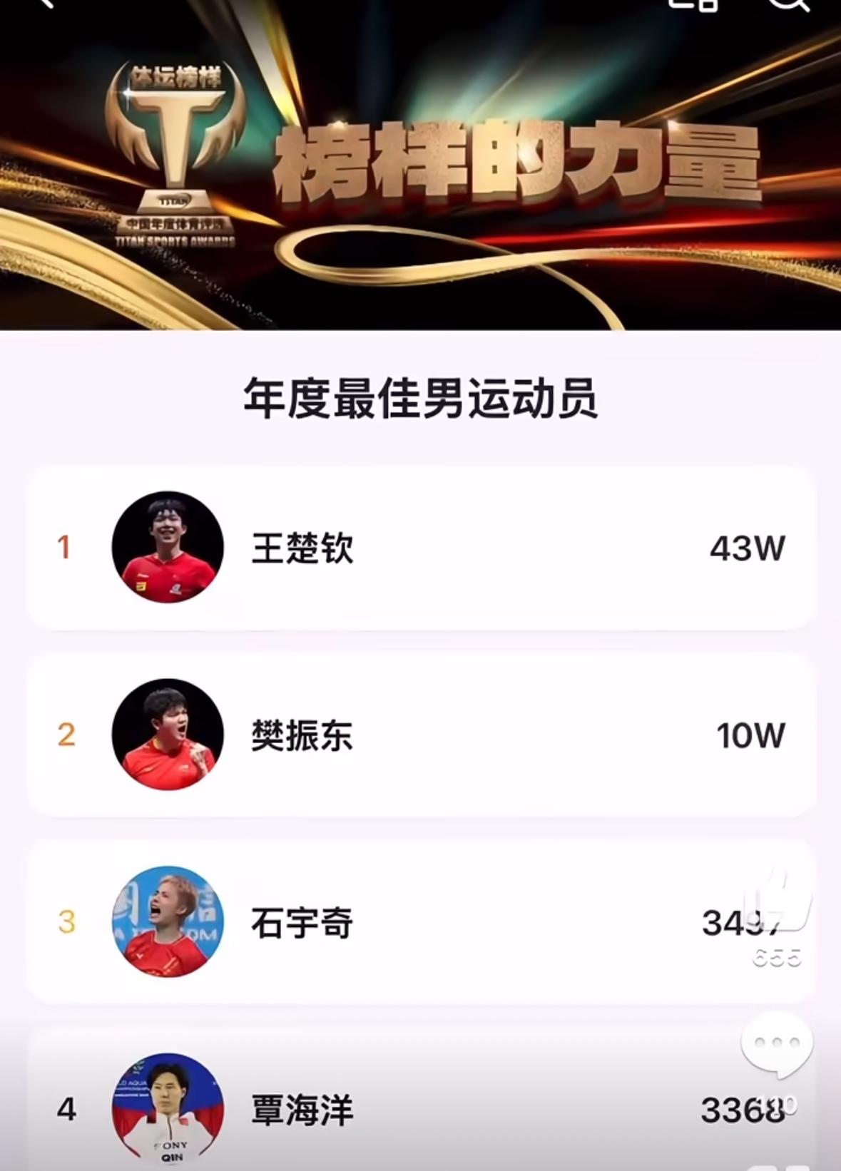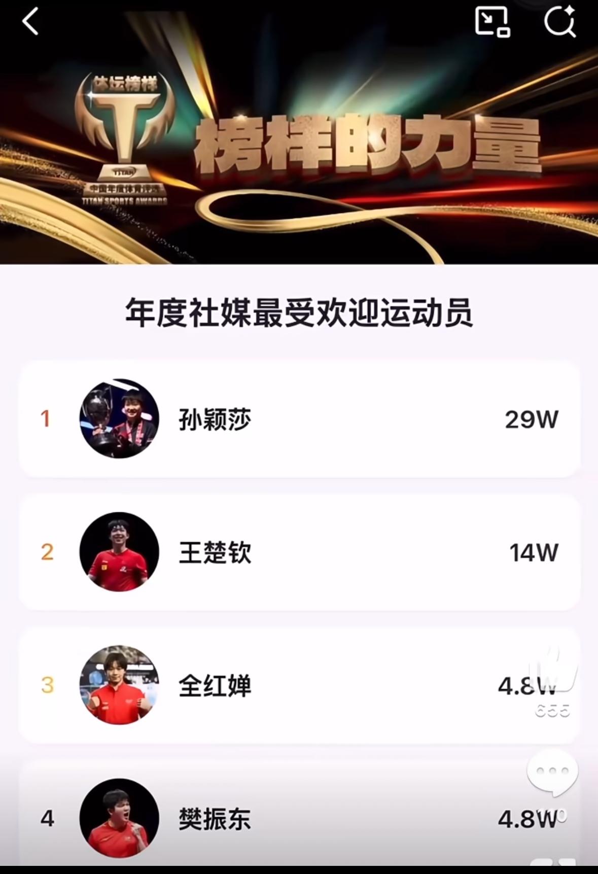 孙颖莎/王楚钦入围最佳年度组合—太优秀啦 孙颖莎入围年度社媒最受欢迎的运动员! 王楚钦入围年度体坛最佳时刻! 这种每人每天只能投一票 的才公正, 起码表面上是公平的, 还有一轮专家投票, 这种断崖式领先, 这就是莎头的人气, 这些荣誉都是众望所归, 实至名归的榜样力量, 我们尽力投票, 至于结果会如愿以偿的, 专家投票占70%, 孙颖莎与王楚钦在2025年 的付出最大, 守住国乒荣誉, 莎头组合获得世乒赛混双三连冠, 这一成绩无人能及, 创造了许多史无前例的战绩, 这样的成绩实至名归!