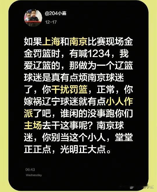 崩不住了!南京对阵上海的比赛里,张镇麟罚球时,现场响起了整齐的“我爱辽篮”口号,有点疑惑,这到底是现场的辽宁球迷喊的,还是主场的南京球迷为了干扰张镇麟罚球而喊的?我记得当时郭艾伦被辽宁交易后,辽篮的比赛里球员罚球时都有辽宁球迷喊“还我艾伦”的口号,这次张镇麟离队后会不会也有球迷故意这样喊呢,不得而知,不过这是上海与南京的比赛,主场球迷故意干扰张镇麟的可能性比较大!