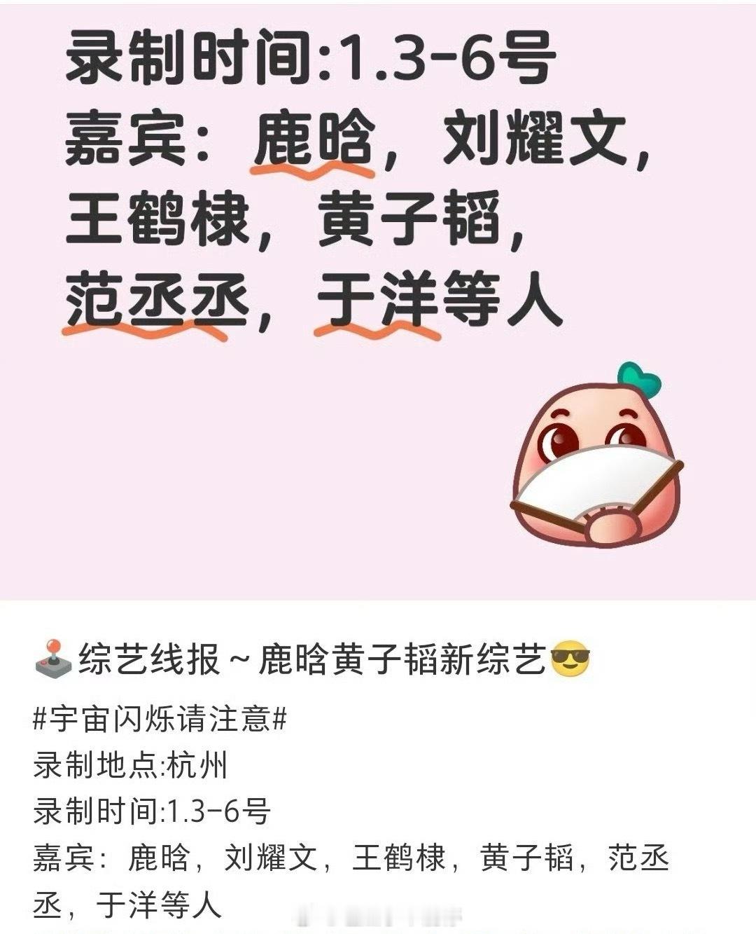 🍉网传范丞丞、鹿晗要去宇宙闪烁请注意这个综艺做飞行嘉宾,这节目常驻有:黄晓明、王鹤棣、黄子韬 、刘耀文、于洋、邵子恒