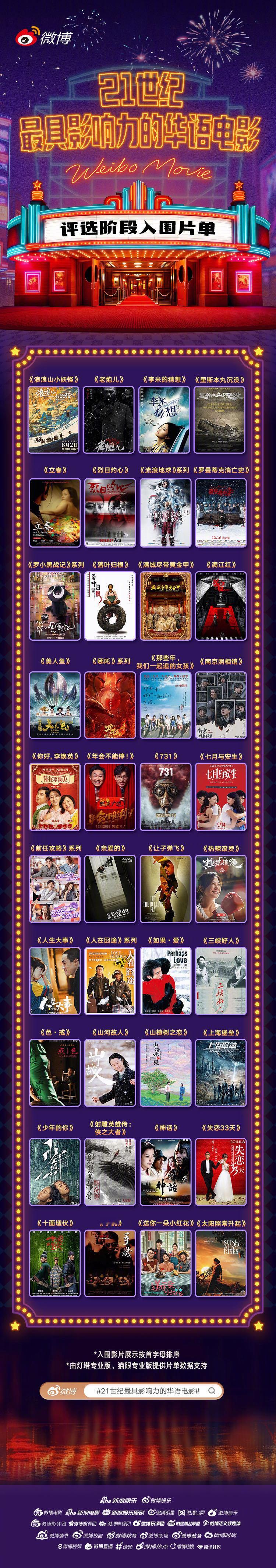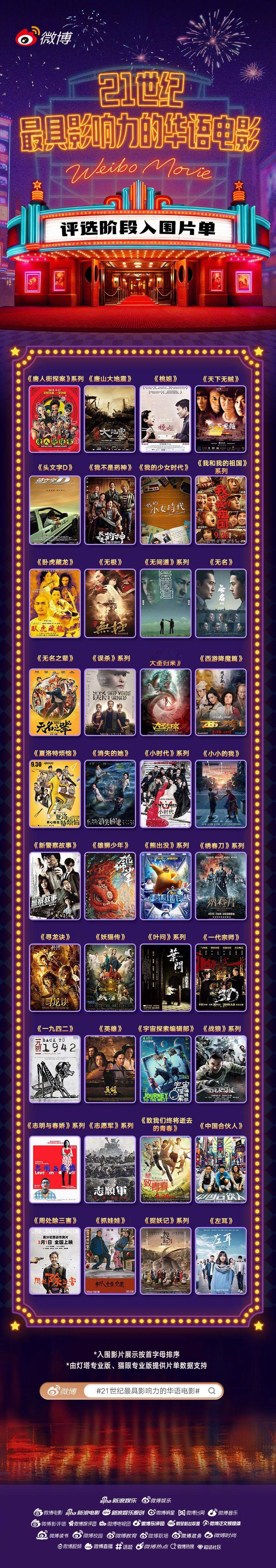 120部21世纪影响力华语片 综合行业人士、各领域博主、影评人及网友提名热度,市场票房表现,观众口碑,所获奖项荣誉,以及其长期的文化与社交影响力等多个维度综合考量,我们汇总整理出了最终入围的120部华语电影。每一部入围作品都是从喧嚣市声与沉默山河中提取的影像切片,凝固了某个年份的悸动、社会的呼吸与美学的锋芒。21世纪最具影响力的华语电影跨年电影愿现在,诚挚邀请每一位热爱电影的你一同入场,选出属于你心中的21世纪最具影响力的华语电影。最终进入TOP20的影片将有机会进行线下特别展映,并解锁影片主创惊喜福利!点击参与>>21世纪最具影响力的华语电影完整片单:花样年华 2000 卧虎藏龙 2000 大腕 2001 无间道 系列 2002 英雄 2002 手机 2003 功夫 2004 天下无贼 2004 新警察故事 2004 十面埋伏 2004 无极 2005 神话 2005 头文字D 2005 如果·爱 2005 疯狂的石头 2006 满城尽带黄金甲 2006 三峡好人 2006 不能说的秘密 2007 落叶归根 2007 太阳照常升起 2007 色,戒 2007 立春 2007 叶问 系列 2008 非诚勿扰 系列 2008 画皮 系列 2008 李米的猜想 2008 长江七号 2008 风声 2009 让子弹飞 2010 唐山大地震 2010 志明与春娇 系列 2010 人在囧途 系列 2010 山楂树之恋 2010 杜拉拉升职记 2010 那些年我们一起追的女孩 2011 桃姐 2011 金陵十三钗 2011 失恋33天 2011 寒战 系列 2012 一九四二 2012 小时代 系列 2013 北京遇上西雅图 2013 一代宗师 2013 中国合伙人 2013 致我们终将逝去的青春 2013 熊出没 系列 2014 前任攻略 系列 2014 西游降魔篇 2014 后会无期 2014 京城81号 2014 亲爱的 2014 白日焰火 2014 战狼 系列 2015 唐人街探案 系列 2015 捉妖记 系列 2015 寻龙诀 2015 夏洛特烦恼 2015 煎饼侠 2015 老炮儿 2015 左耳 2015 我的少女时代 2015 烈日灼心 2015 二十二 2015 刺客聂隐娘 2015 西游记之大圣归来 2015 纯洁心灵·逐梦演艺圈 2015 山河故人 2015 美人鱼 2016 长城 2016 大鱼海棠 2016 摆渡人 2016 七月与安生 2016 罗曼蒂克消亡史 2016 芳华 2017 妖猫传 2017 绣春刀 系列 2017 嘉年华 2017 红海行动 2018 我不是药神 2018 狄仁杰 系列 2018 无名之辈 2018 地球最后的夜晚 2018 风中有朵雨做的云 2018 误杀 系列 2019 流浪地球 系列 2019 飞驰人生 系列 2019 我和我的祖国 系列 2019 少年的你 2019 罗小黑战记 系列 2019 地久天长 2019 上海堡垒 2019 八佰 2020 送你一朵小红花 2020 长津湖 系列 2020 你好,李焕英 2021 爱情神话 2021 雄狮少年 2021 宇宙探索编辑部 2021 人生大事 2022 满江红 2023 孤注一掷 2023 消失的她 2023 封神 系列 2023 长安三万里 2023 年会不能停! 2023 志愿军 系列 2023 无名 2023 热辣滚烫 2024 抓娃娃 2024 小小的我 2024 好东西 2024 周处除三害 2024 里斯本丸沉没 2024 出走的决心 2024 哪吒 系列 2025 南京照相馆 2025 731 2025 浪浪山小妖怪 2025 狂野时代 2025 射雕英雄传:侠之大者 2025