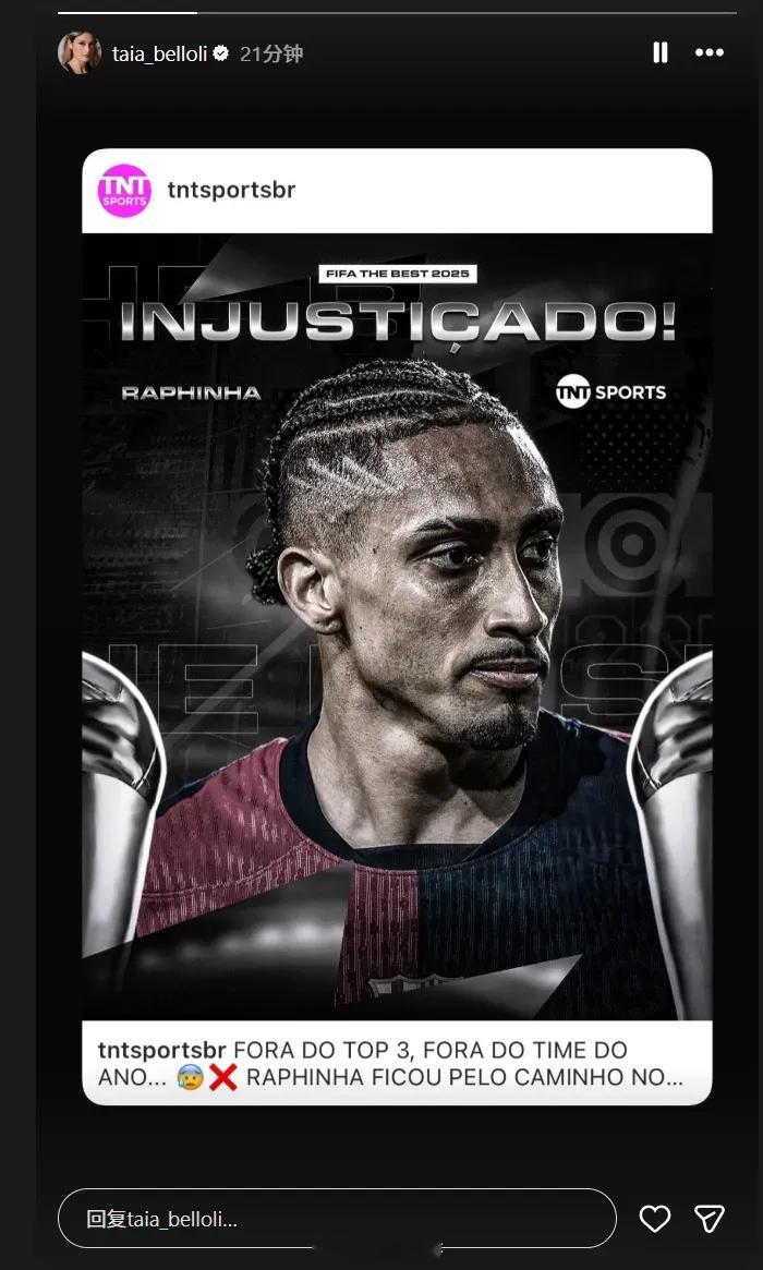 FIFA年度最佳阵容出炉,拉菲尼亚竟然意外落选,他的妻子可不干了。她在社媒连发四条动态开怼,情绪越来越激动:“他们现在连演都不演了是吧?”“62个进球助攻都换不来一个最佳位置?”“太不公平了!”最后还讽刺道:“难道我老公是篮球运动员吗?!”也难怪她这么生气,入选的包括登贝莱、多纳鲁马,巴萨的亚马尔和佩德罗也进了,可就是没拉菲尼亚。其实,贝林厄姆入选,很多球迷都拥有不同的态度,而拉菲尼亚表现如此出色,他完全配得上入选最佳阵容。登贝莱金球奖FIFA最佳双料得主