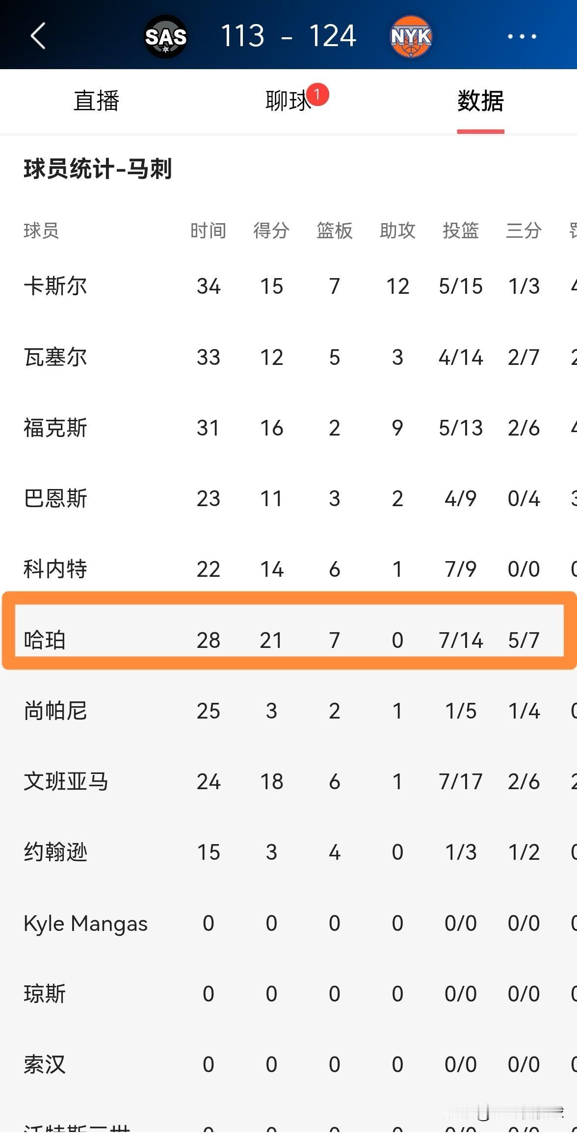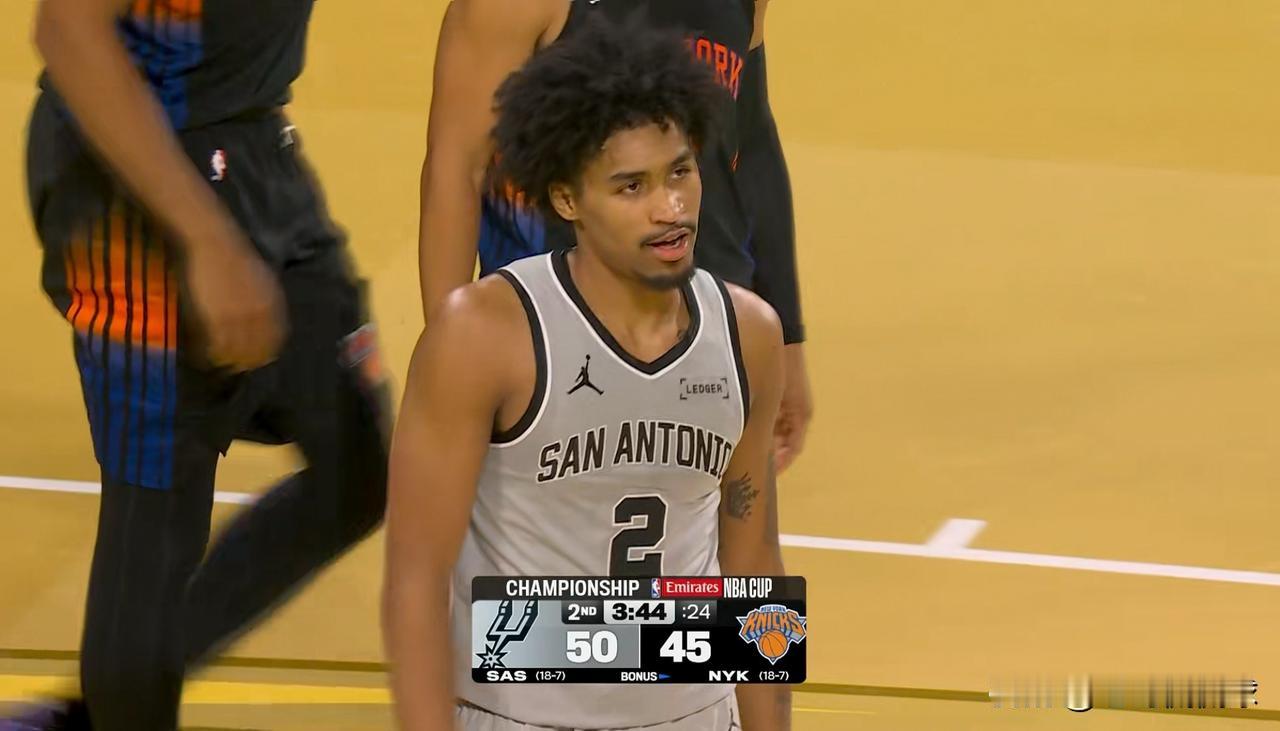 马刺新秀哈珀真是未来可期!虽然今天马刺在NBA杯决赛中以113:124不敌尼克斯错失冠军,但是小将哈珀的表现真是无可争议。 整场比赛下来,哈珀替补出战28分钟,投篮14中7,其中三分球7中5、罚球2中2得到21分7篮板,没有出现任何的失误。 虽然哈珀仅仅是一名新秀,但是他在场上展现出了成为超级巨星的潜力,我相信在三年之内哈珀一定能够成为马刺的当家后卫。