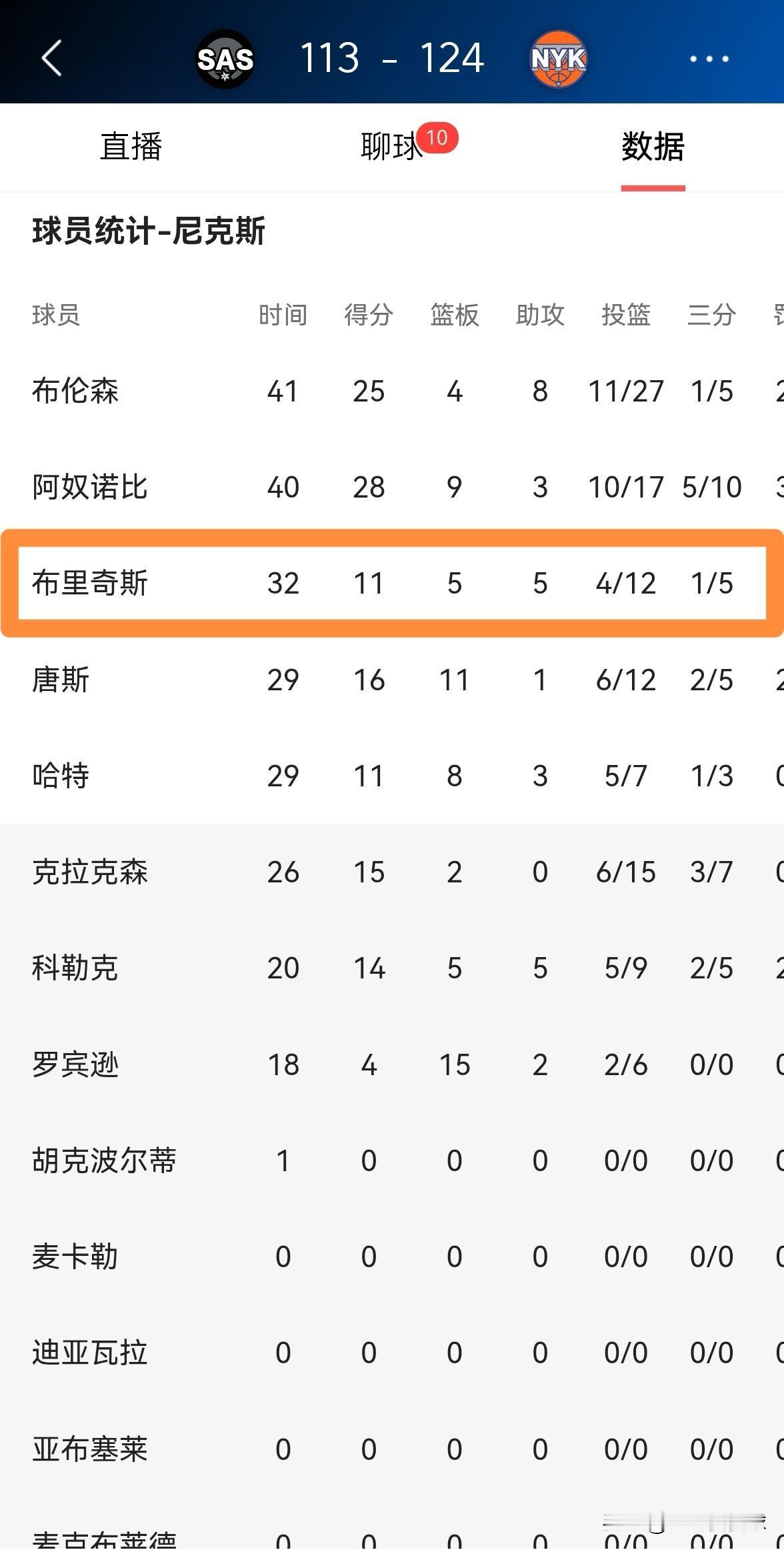 尼克斯球星布里奇斯真是太铁了!在今天尼克斯以124:113战胜马刺的NBA杯决赛中,布里奇斯的手感异常冰凉,他在首发出战的32分钟里,投篮12中4,其中三分球5中1非常低效的得到11分,他的场上正负值为全队最低的-10。 在我看来,布里奇斯应该将自己的一部分夺冠奖金分给其他队友,毕竟以布里奇斯的低迷表现来看,他不配得到那么多的奖金。
