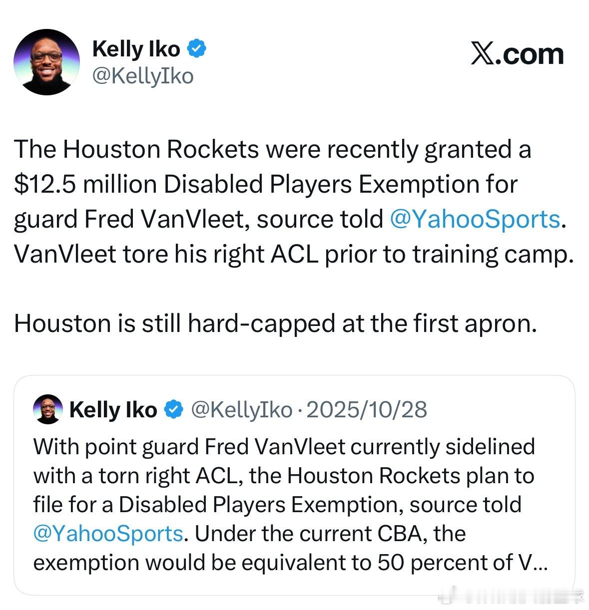 雅虎记者Kelly Iko报道,休斯顿火箭队后卫弗雷德·范弗里特在训练营开始前遭遇右膝前交叉韧带撕裂,球队已因此获得1250万美元的伤病特例。目前火箭队仍受第一硬帽限制。休斯顿火箭nba常规赛休斯顿火箭