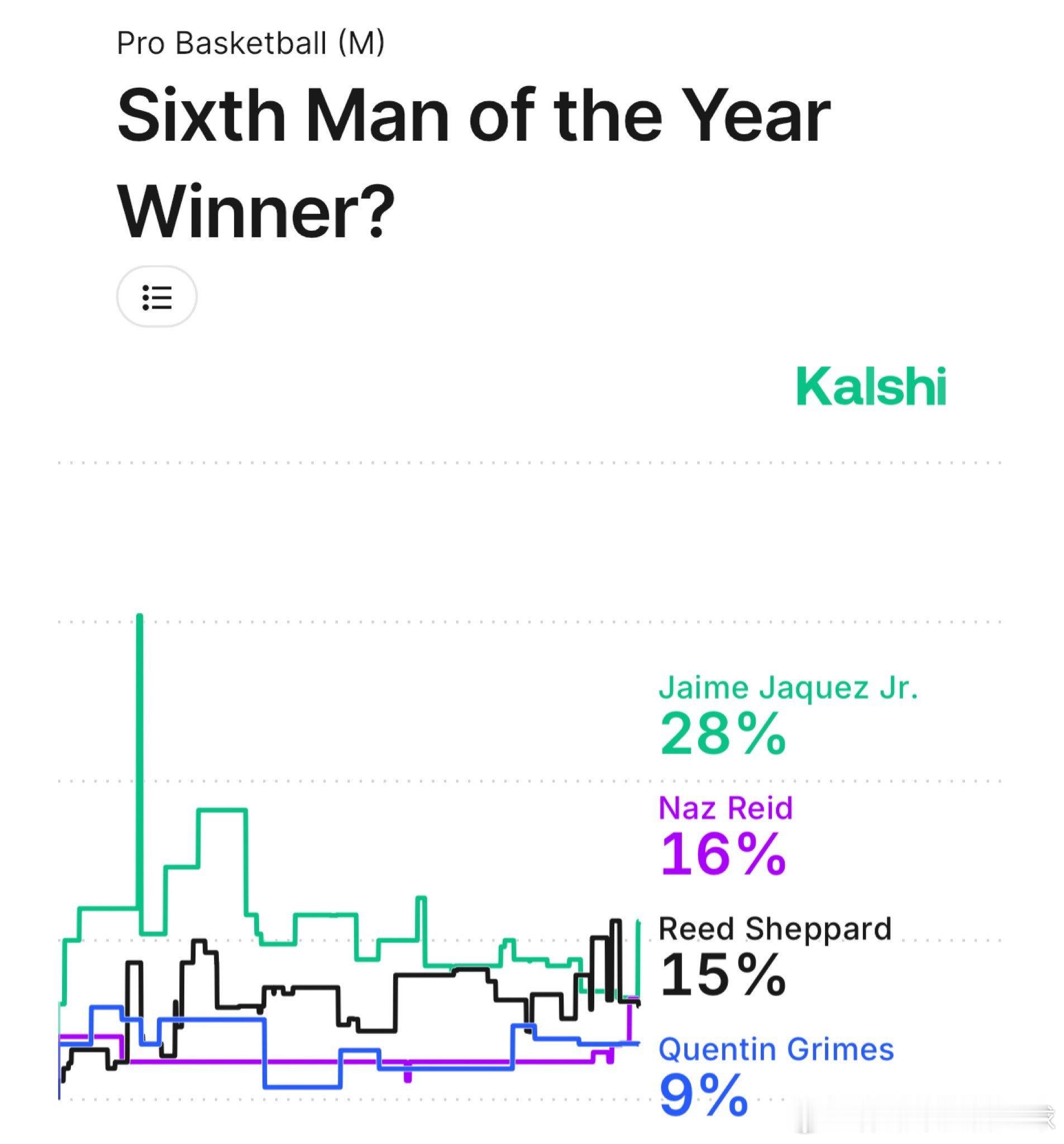 卡希(Kalshi)平台上的最佳第六人奖项赔率竞争十分激烈:▪️28% — 海梅·哈克斯▪️16% — 纳兹·里德▪️15% — 里德·谢泼德▪️9% — 昆汀·格莱姆斯里德·谢泼德本赛季场均数据:12.9分 | 3.1助攻 | 3.1篮板 | 1.6抢断 | (真实命中率59.4% | 三分命中率43.7% | 场均三分出手5.9次)最近从他身上看到了我非常欣赏的自信。以他的年龄和出手量来看,他的三分投射依然处于历史级的高效水平。火箭vs掘金休斯顿火箭休斯顿火箭